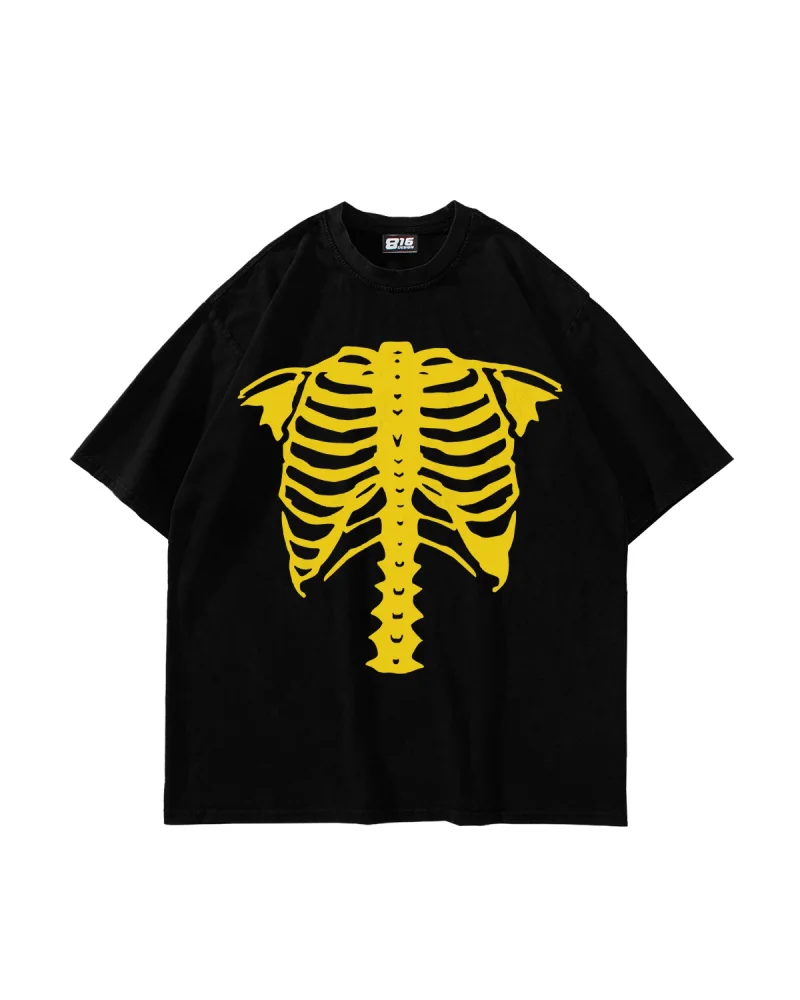 Yellow Ribcage Baskılı Oversize Unisex Siyah Tshirt