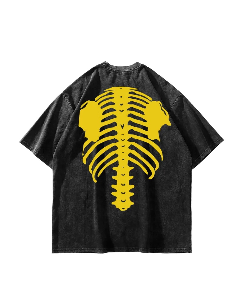 Yellow Ribcage Baskılı Oversize Unisex Yıkamalı Siyah Tshirt