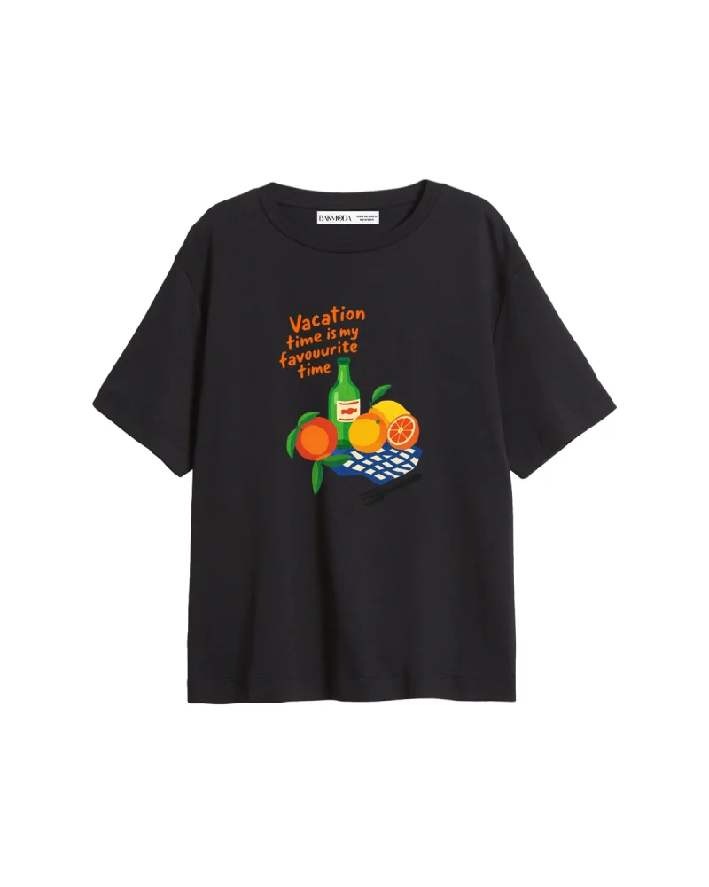Fruits Baskılı Relaxed Fit Siyah Kadın Tshirt