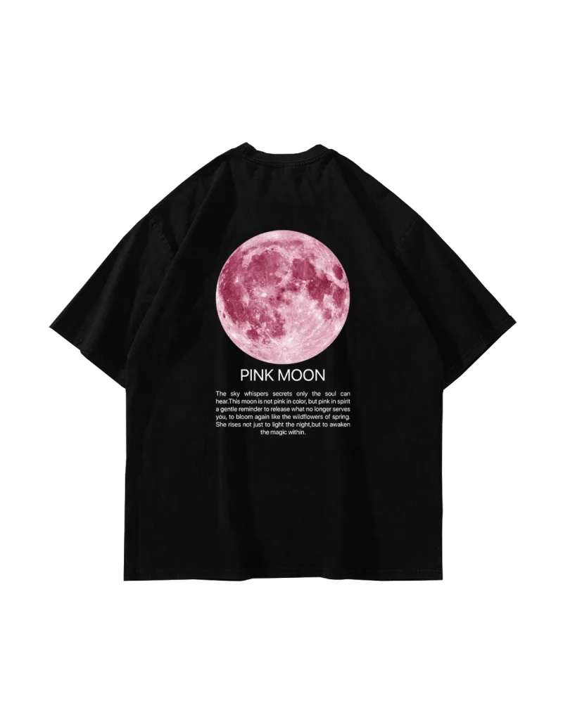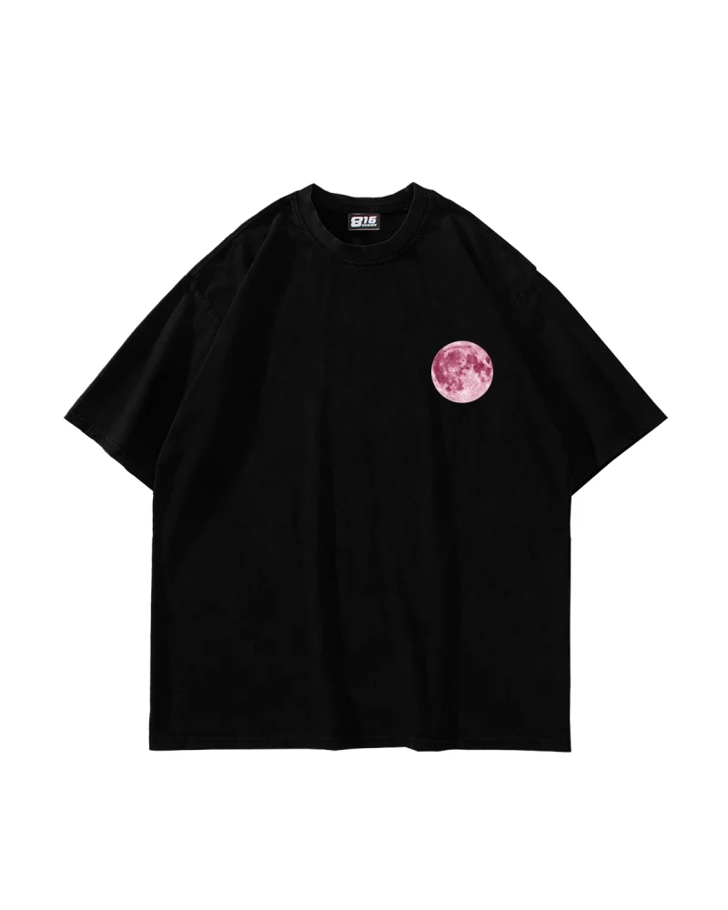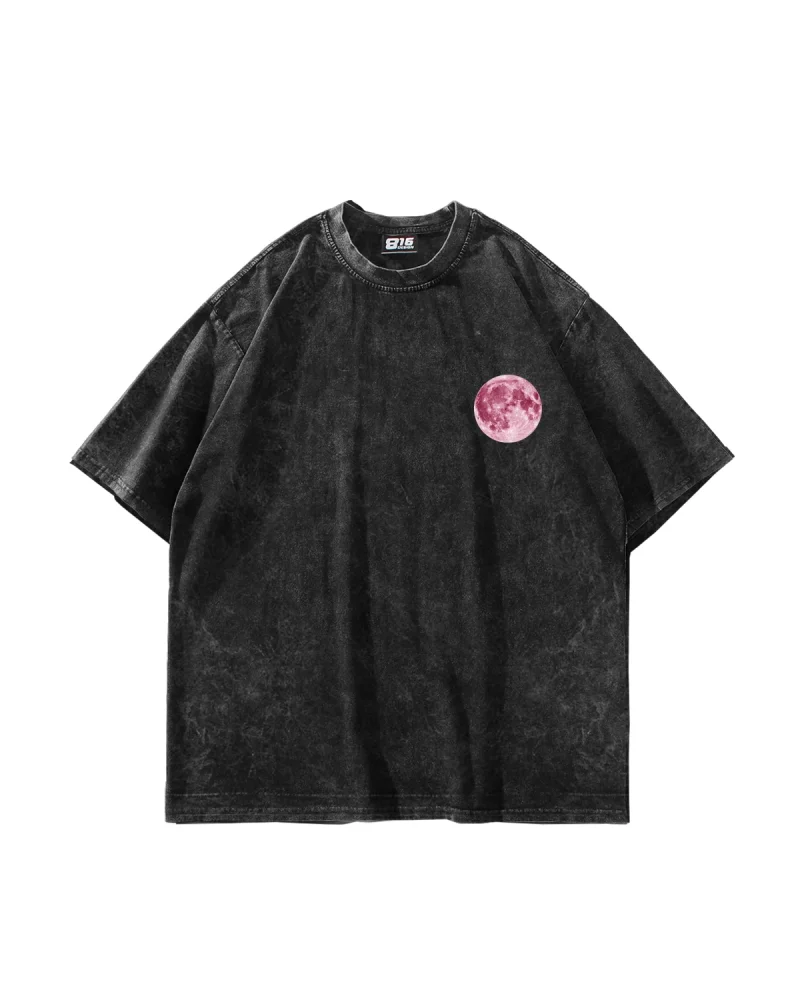 Pink Moon Baskılı Oversize Unisex Yıkamalı Siyah Tshirt