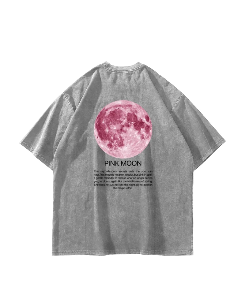 Pink Moon Baskılı Oversize Unisex Yıkamalı Beyaz Tshirt