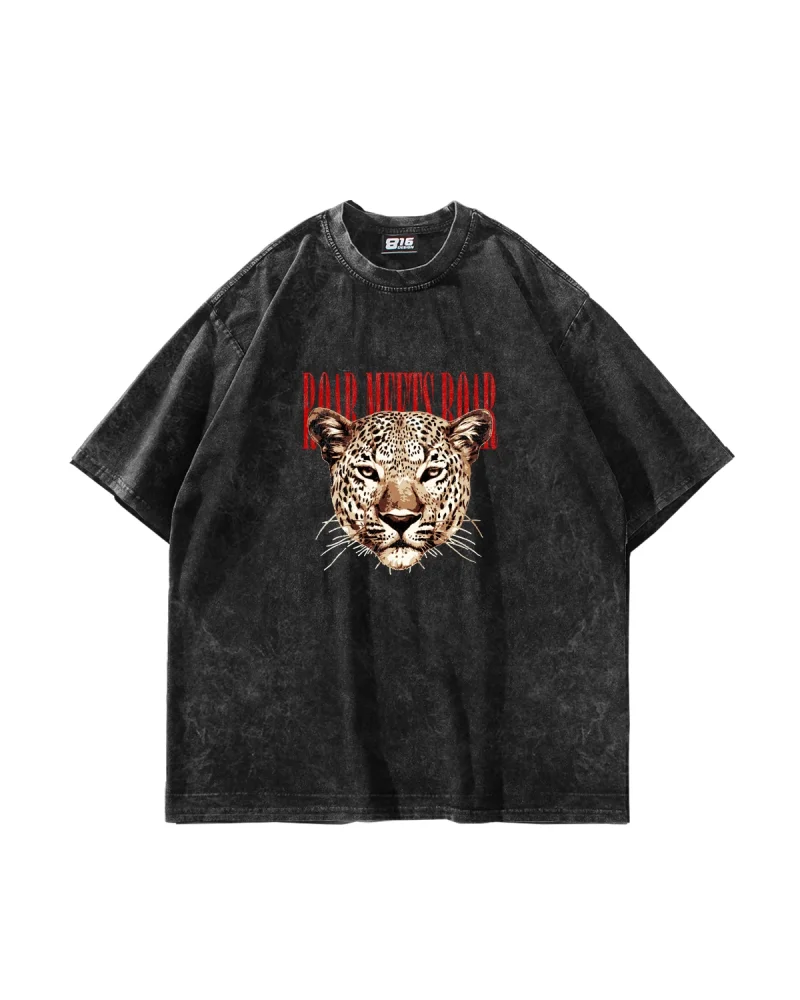 Roar Meets Baskılı Oversize Unisex Yıkamalı Siyah Tshirt