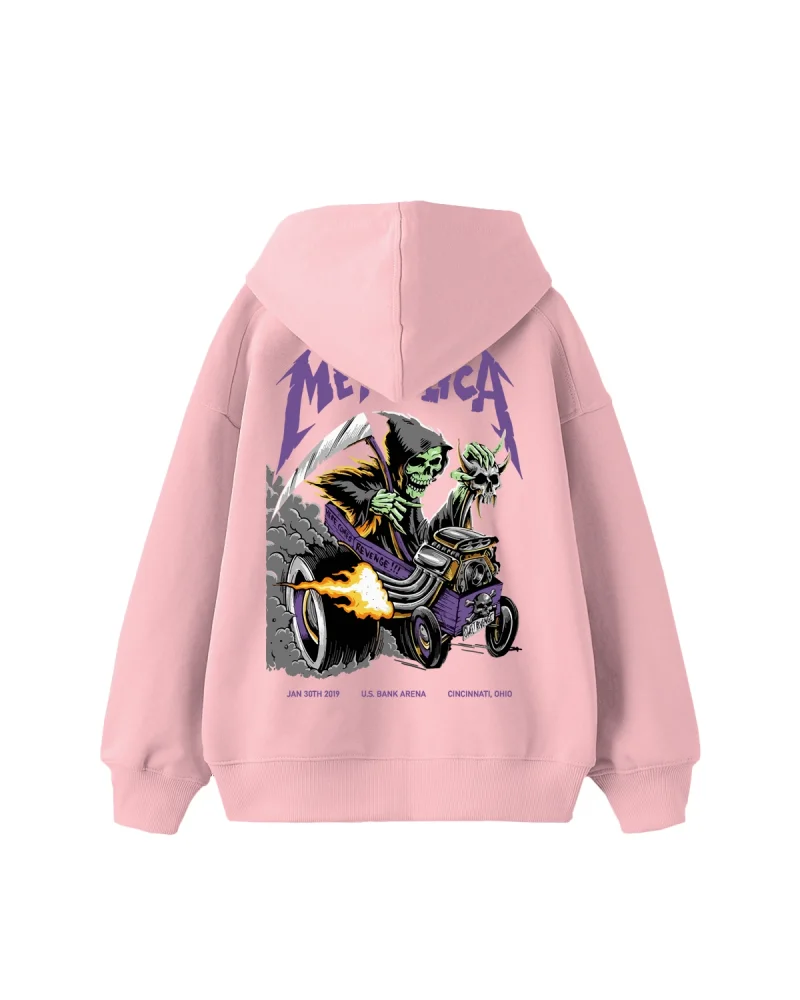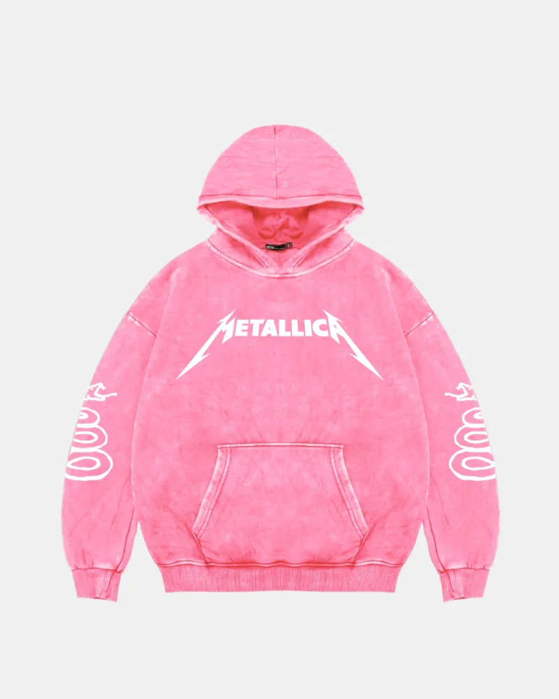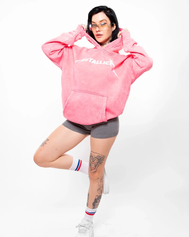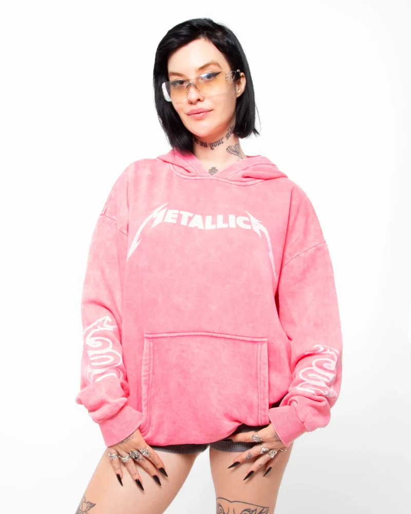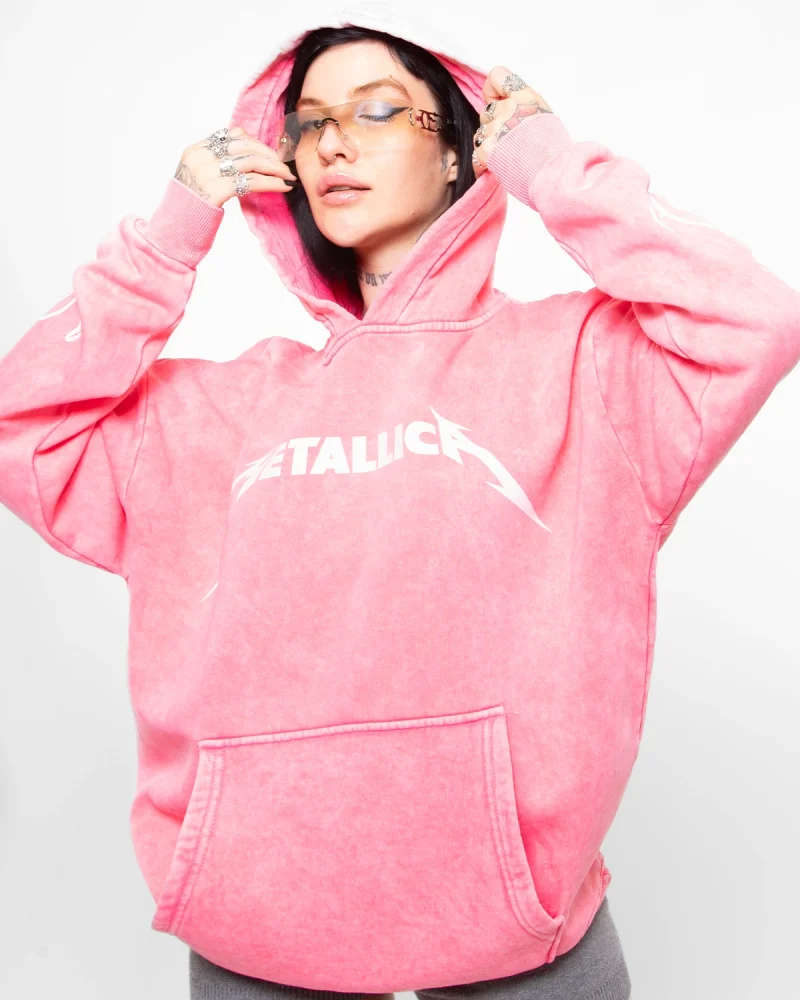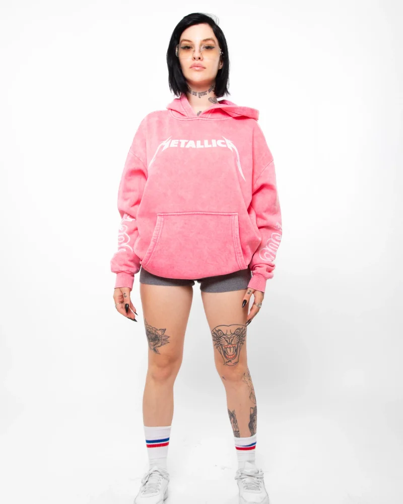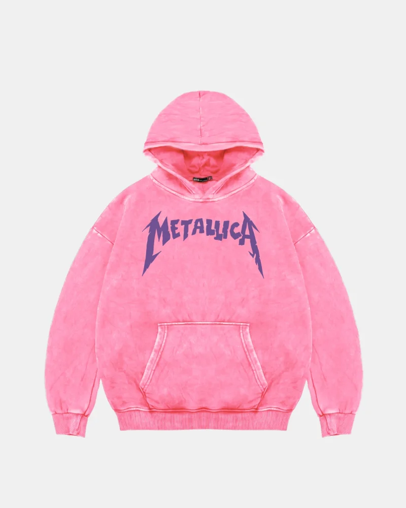 Metallica Mor Baskılı Oversize Kadın Yıkamalı Pembe Hoodie