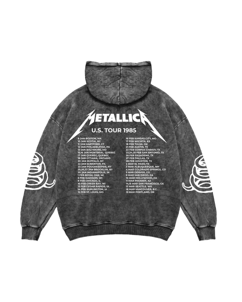 Metallica Tour 1985 Baskılı Kadın Yıkamalı Siyah Hoodie