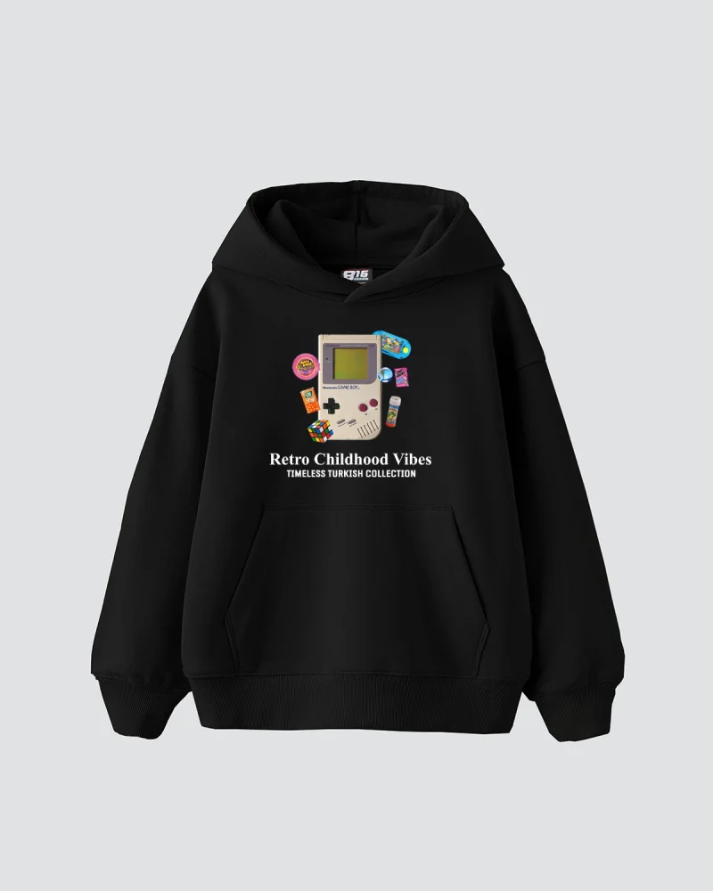 Retro Childhood Vibes Baskılı Oversize Kadın Siyah Hoodie