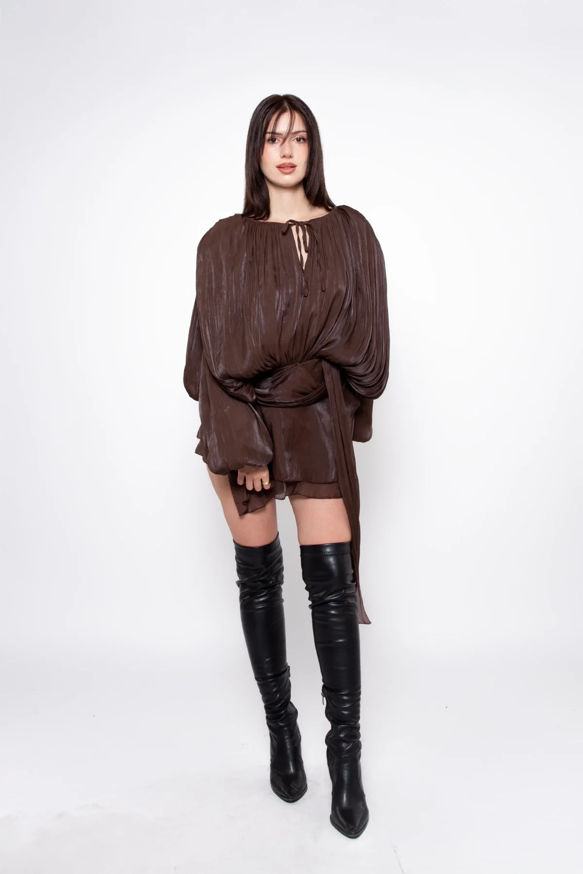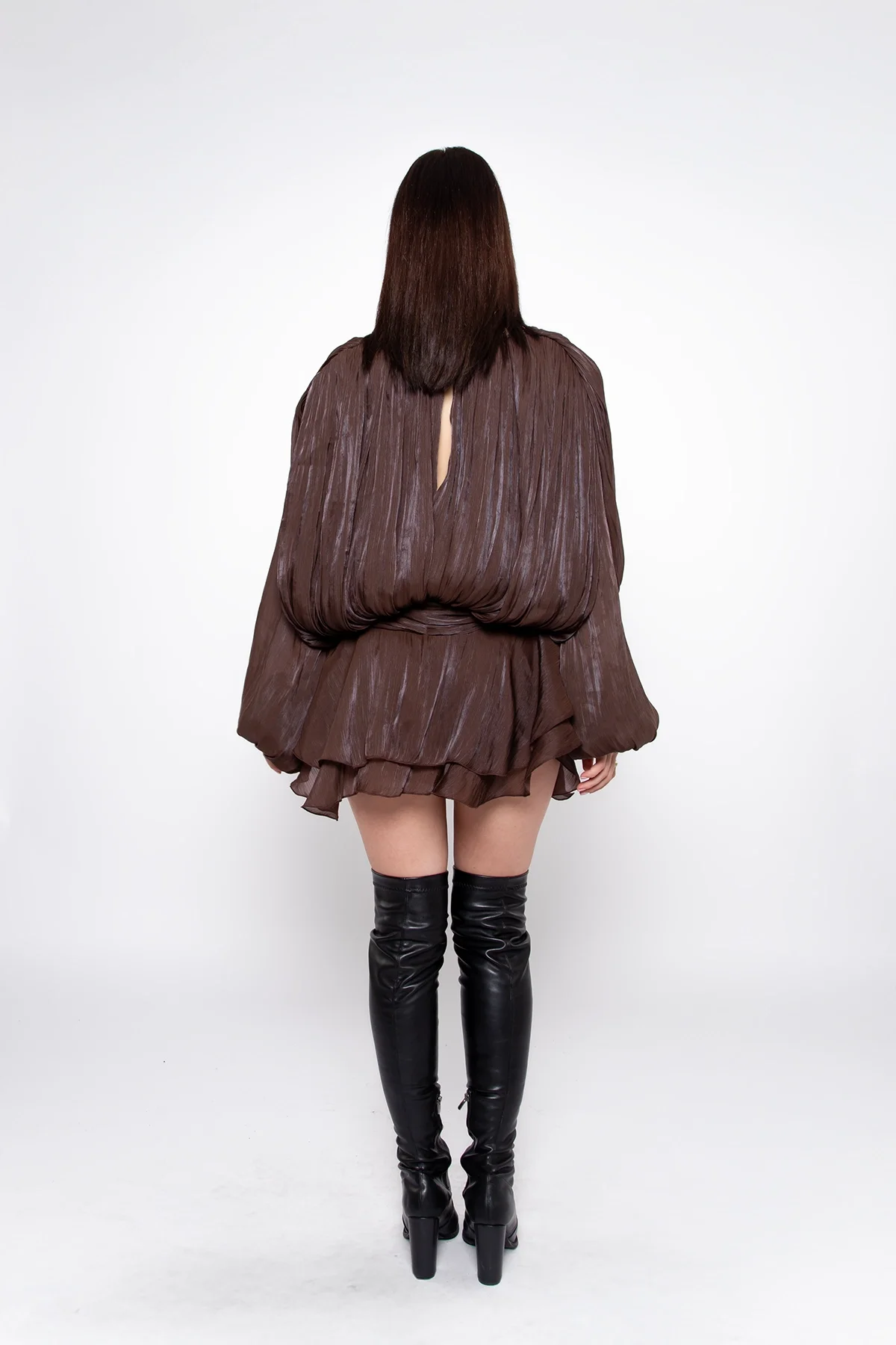 Vatkalı Jakarlı Tül Kahverengi Elbise – Zarafetin Güçlü Dokunuşu