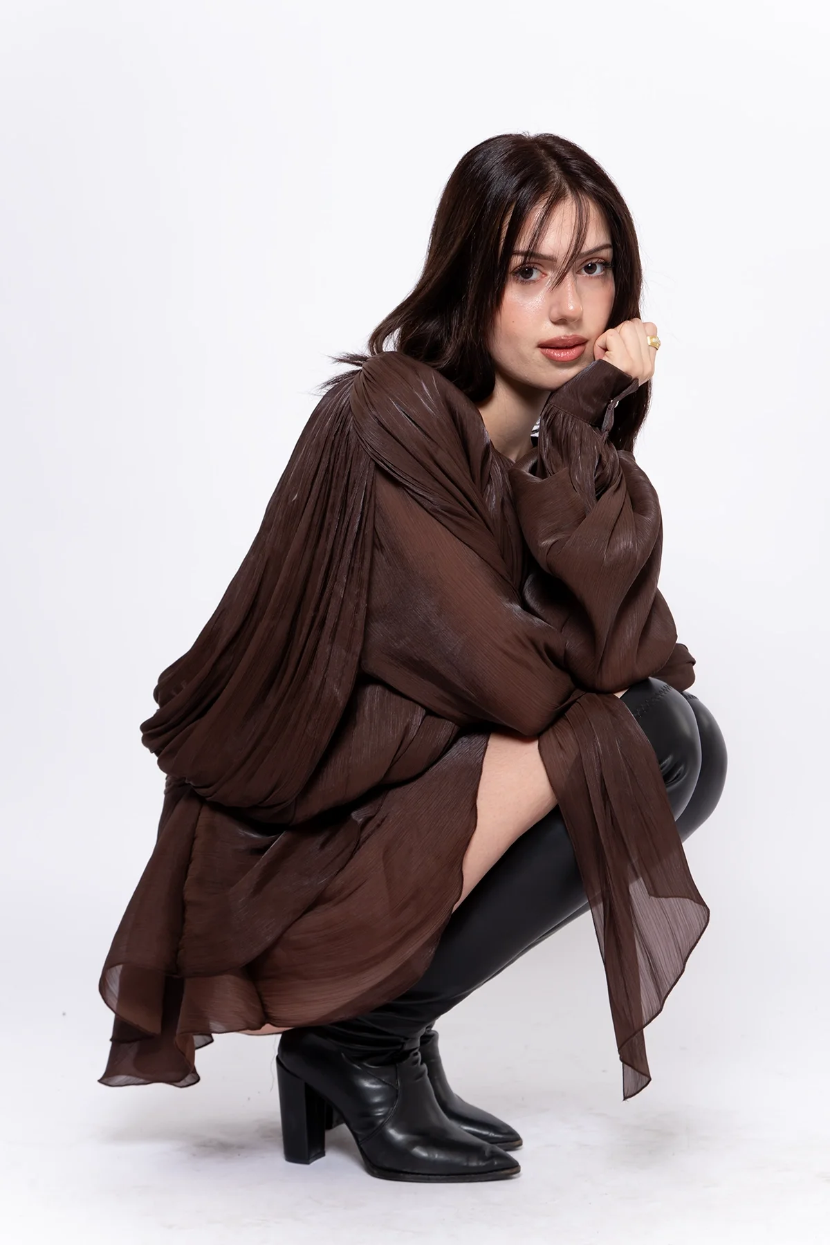 Modern çizgileri klasik şıklıkla buluşturan Vatkalı Jakarlı Tül Kahverengi Elbise, özel davetlerden kokteyl gecelerine kadar her ortamda göz kamaştırmanız için tasarlandı. Jakarlı dokunun zarif desenleri, tülün hafif ve romantik yapısıyla birleşerek feminen bir silüet oluşturur.