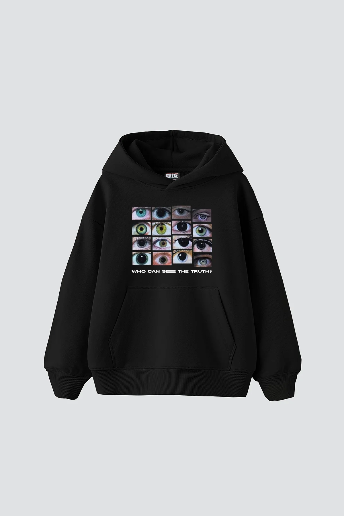WHO CAN SEE BASKILI OVERSİZE UNİSEX PREMİUM SİYAH HOODİE
