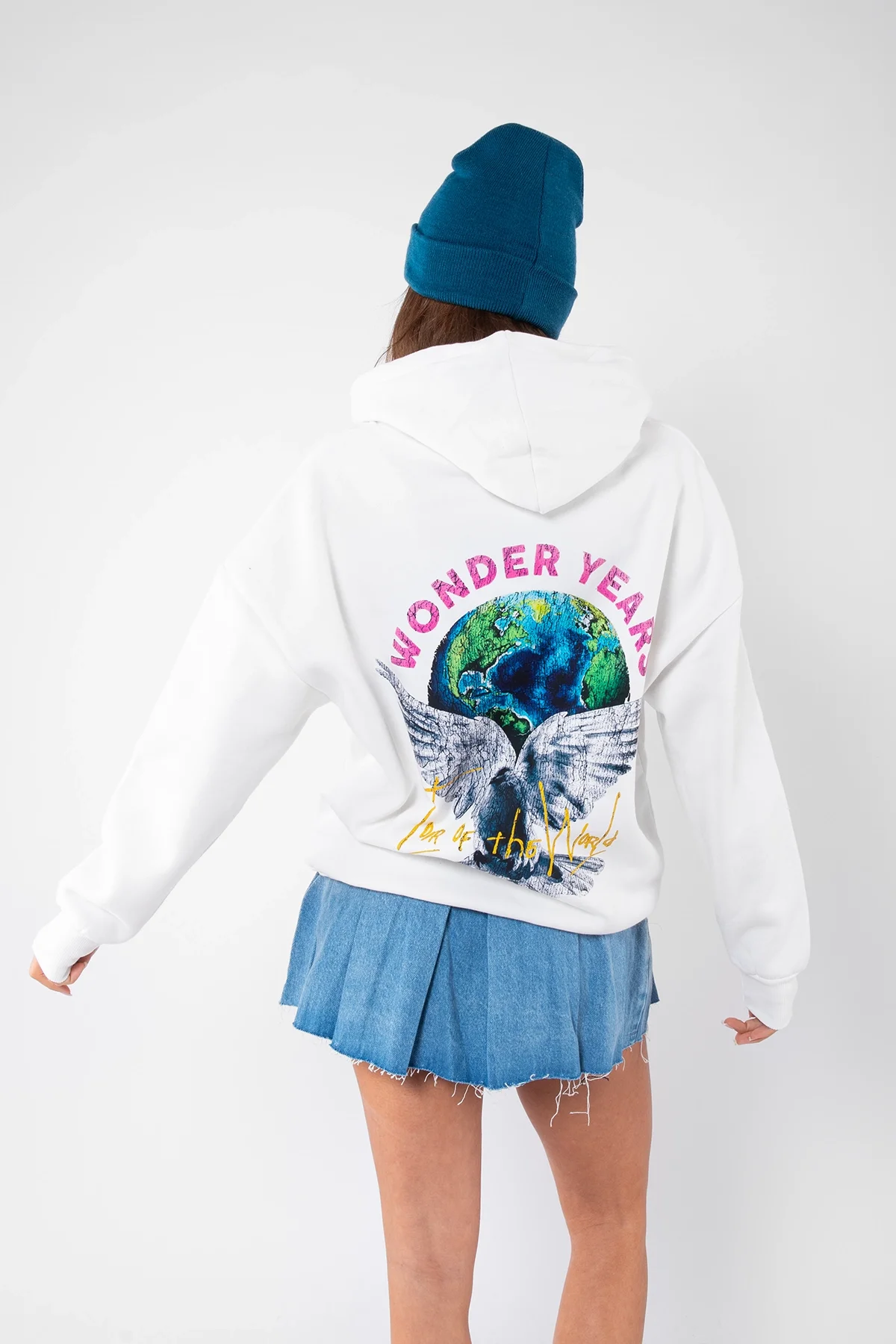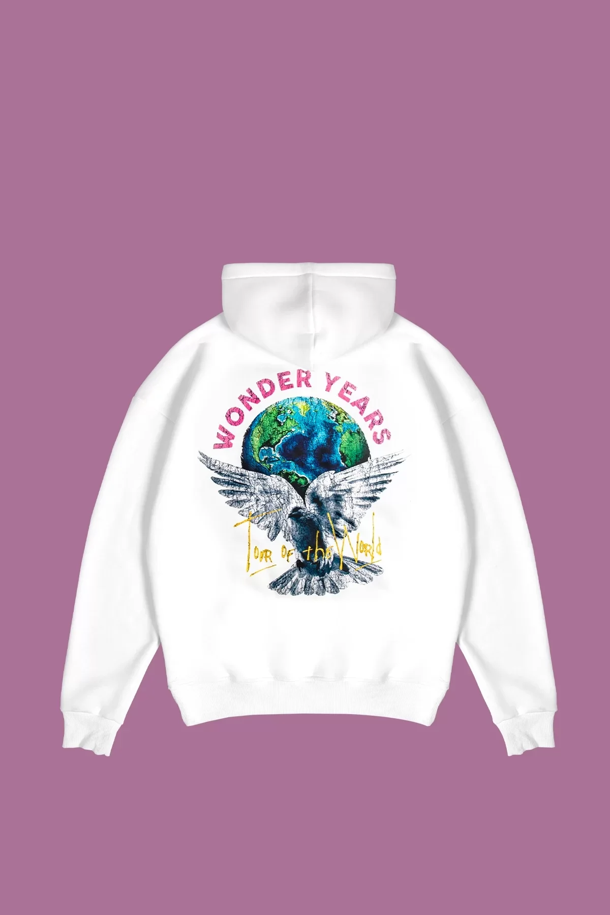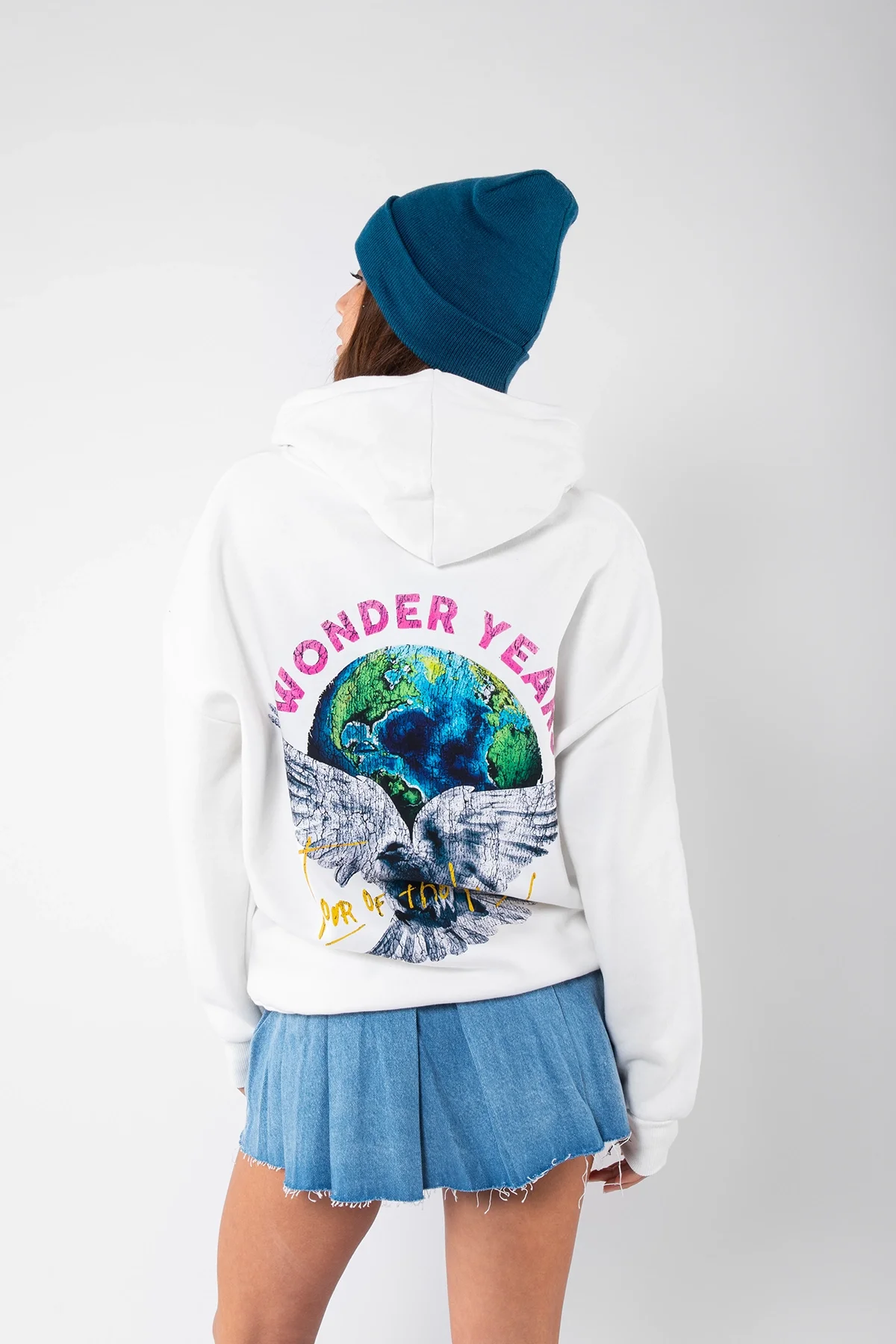 WONDER YEARS BASKILI OVERSİZE UNİSEX BEYAZ HOODİE