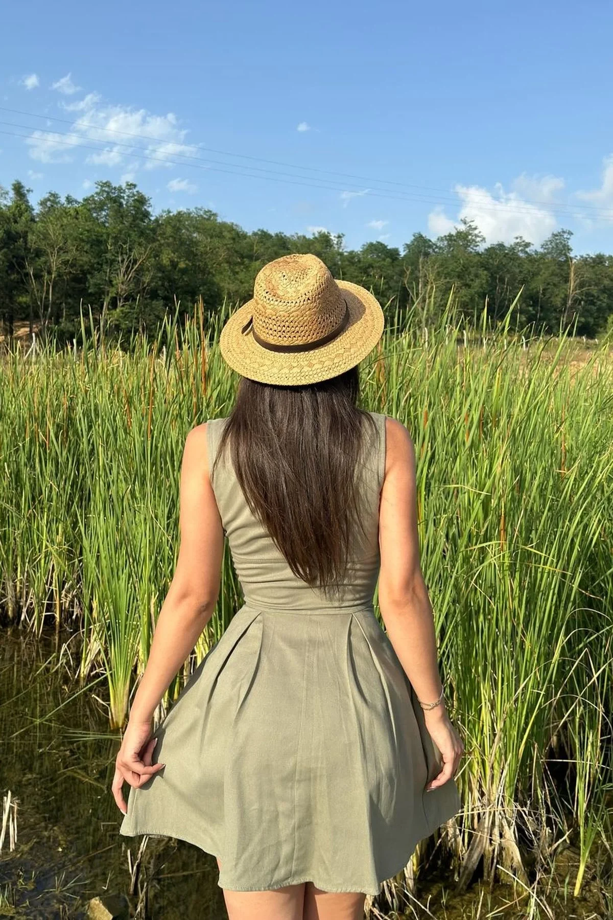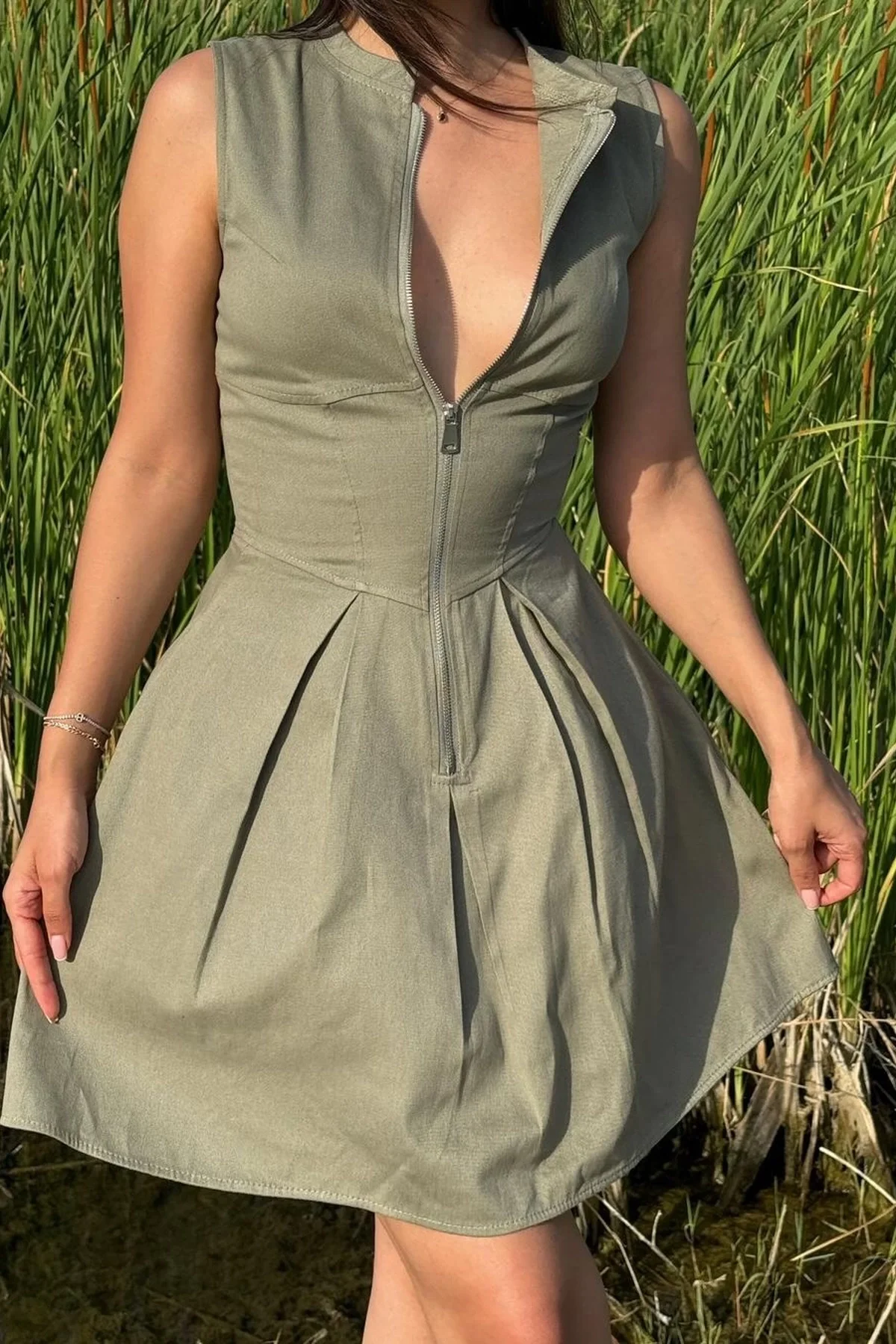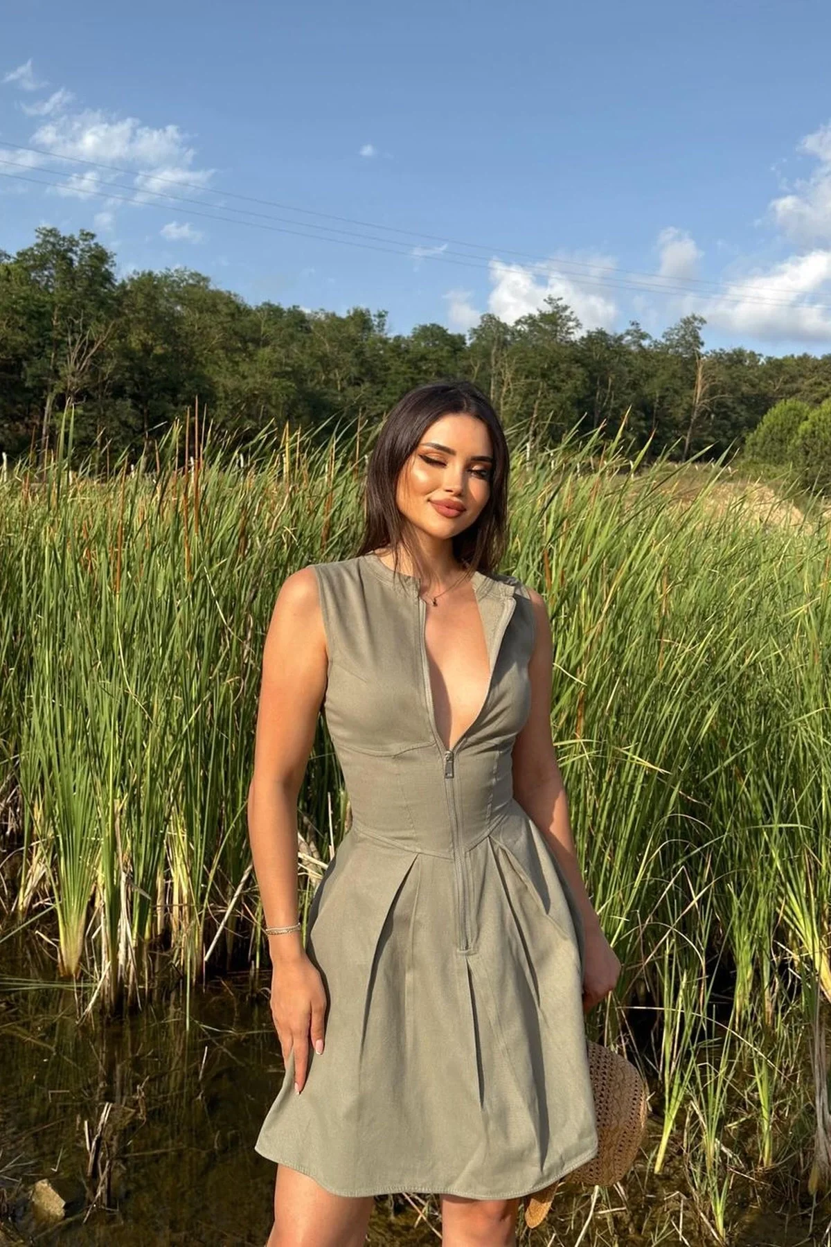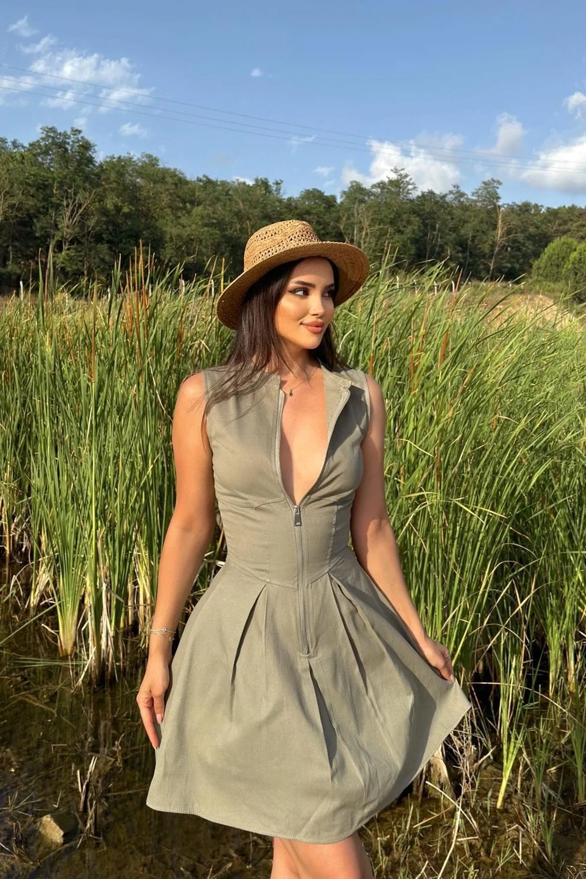 Şık ve modern tasarımıyla öne çıkan yarım fermuarlı, sıfır kollu haki mini elbise; zarif detaylarıyla hem günlük hem özel davetlerde şıklığınızı tamamlar.