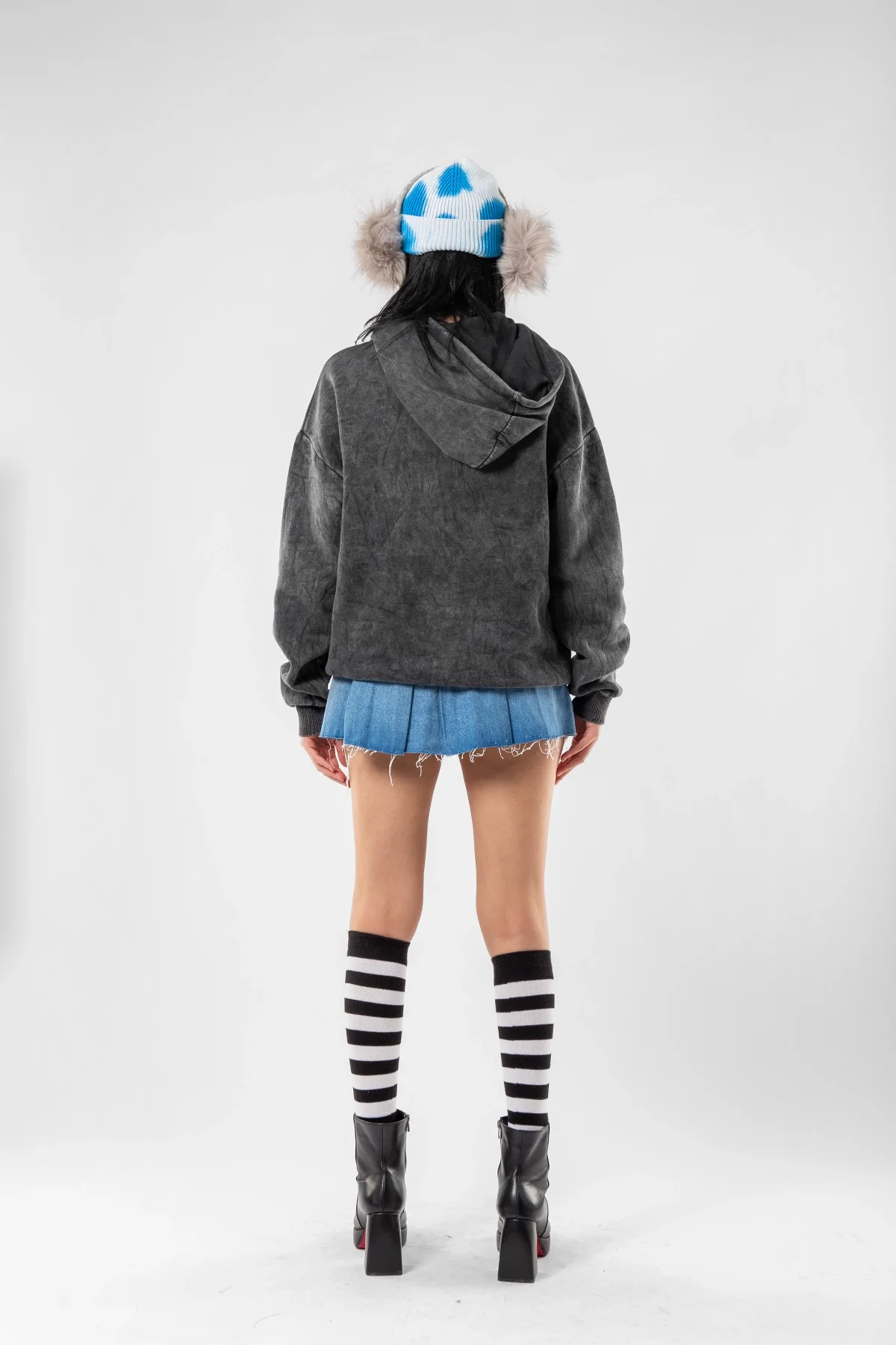 Sırt Baskılı Leopar Yıldız Baskılı Oversize Unisex Yıkamalı Siyah Hoodie