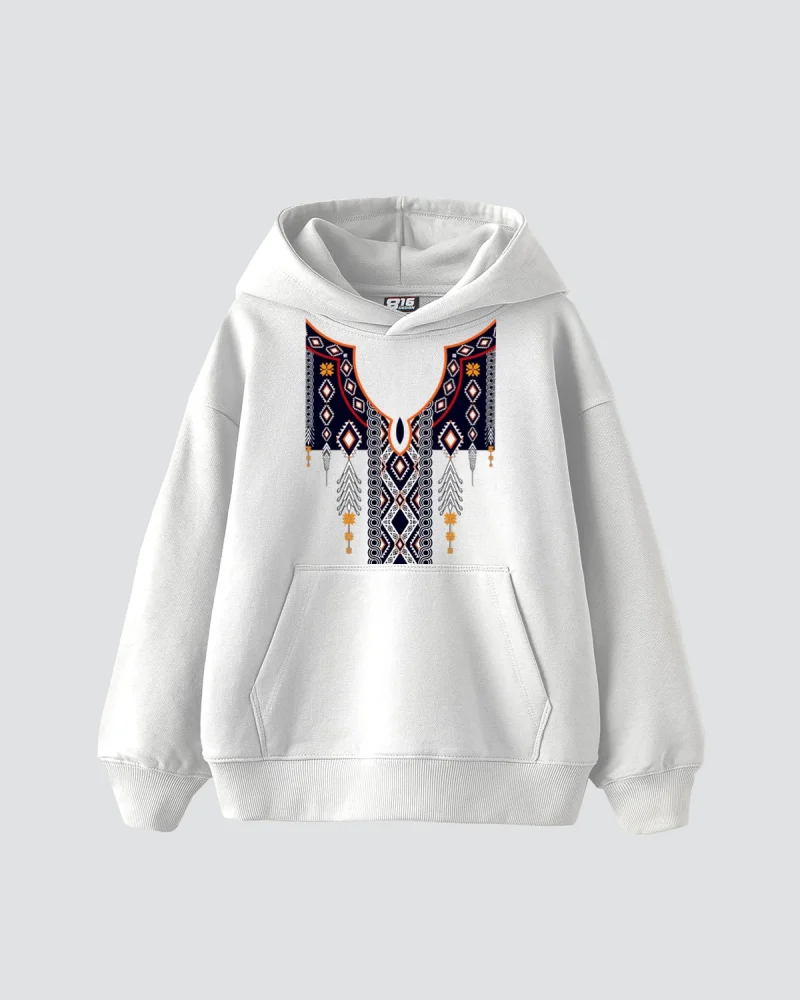 Etnik Desen Baskılı Oversize Unisex Beyaz Hoodie