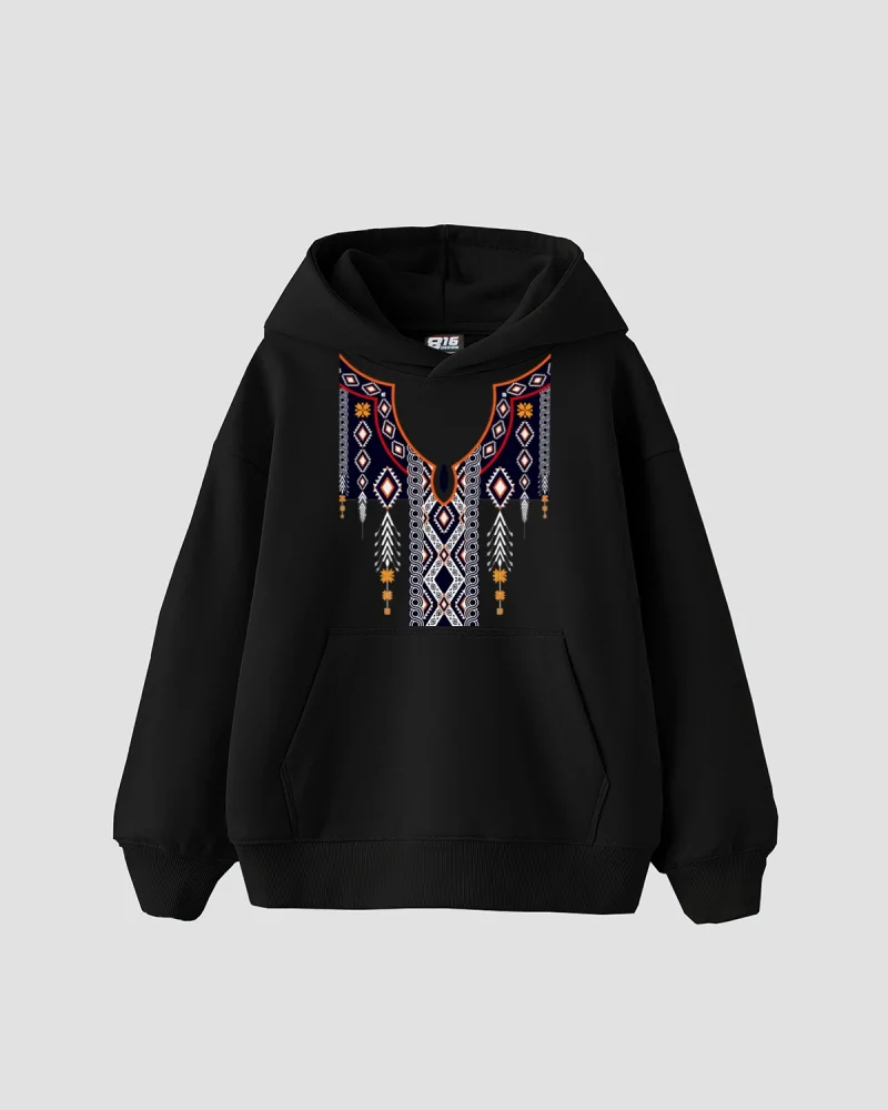 Etnik Desen Baskılı Oversize Unisex Siyah Hoodie