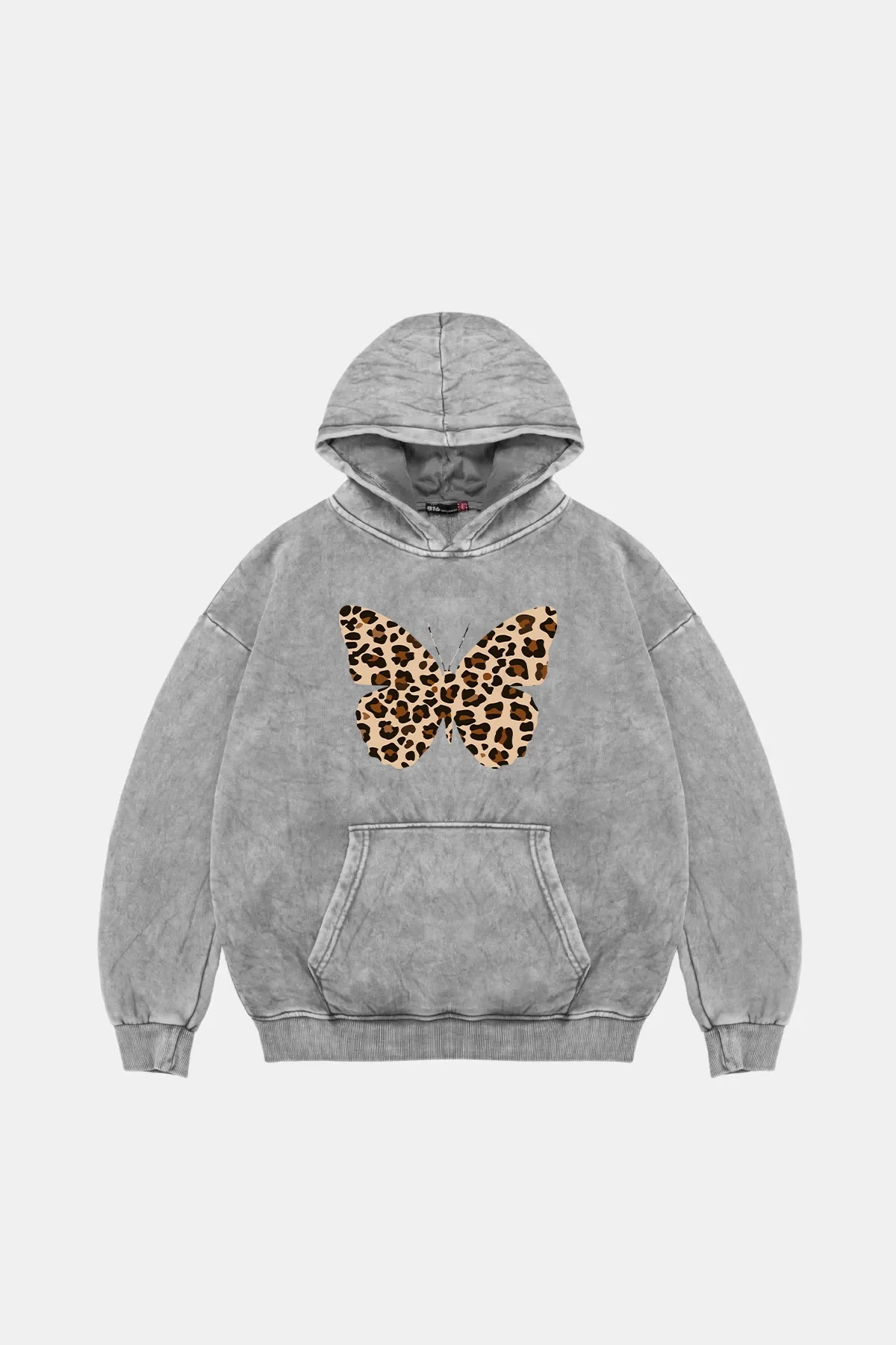 BUTTERFLY LEOPARD BASKILI OVERSİZE UNİSEX PREMİUM YIKAMALI BEYAZ HOODİE