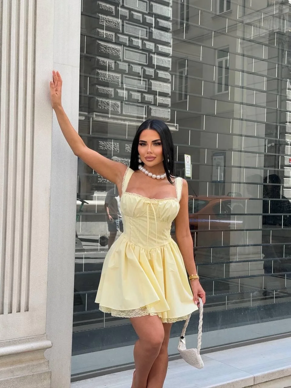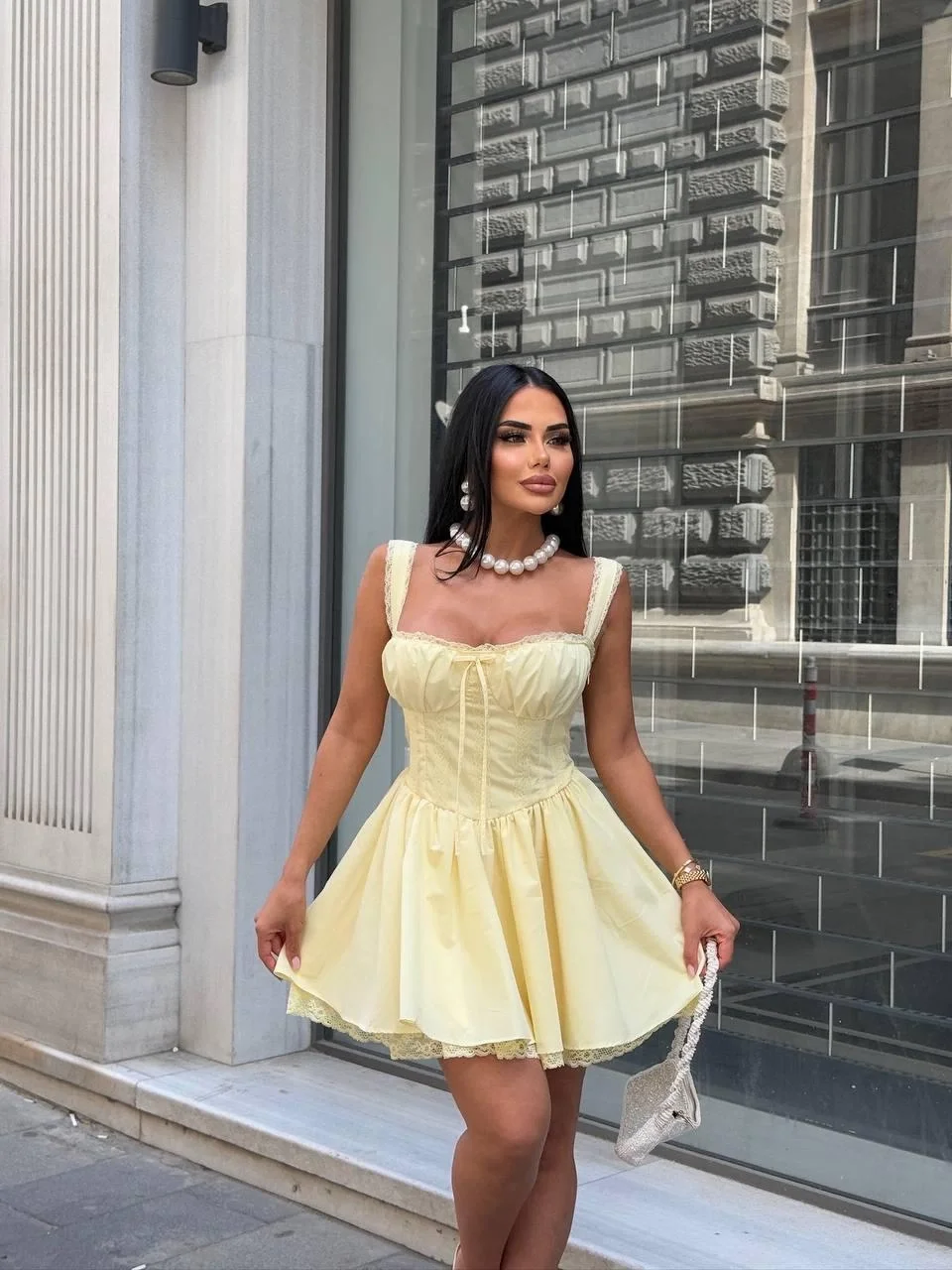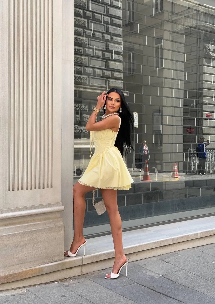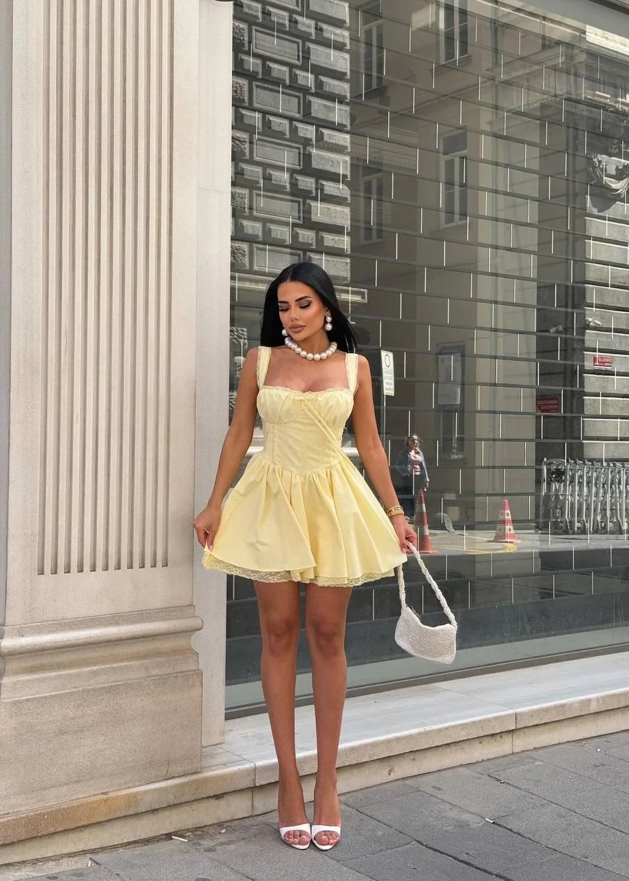 Zarafet ve şıklığın buluştuğu bu askılı dantel işlemeli elbise, özel günlerin vazgeçilmezi olacak. İnce askıları ve vücudu saran kesimiyle feminen bir siluet sunarken, özenle işlenmiş dantel detaylar romantik ve sofistike bir hava katıyor.