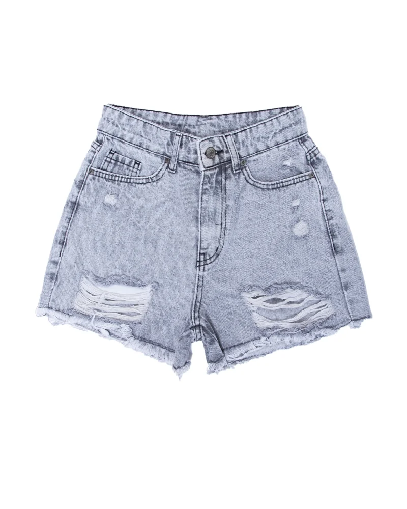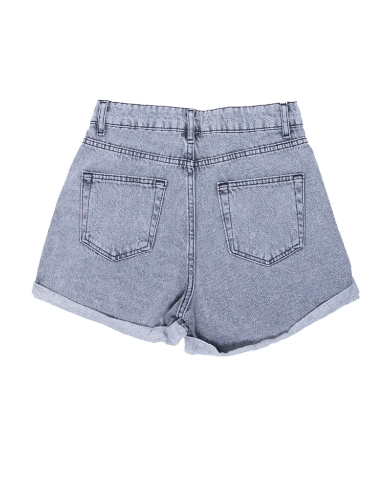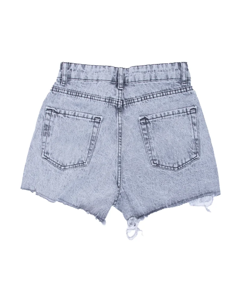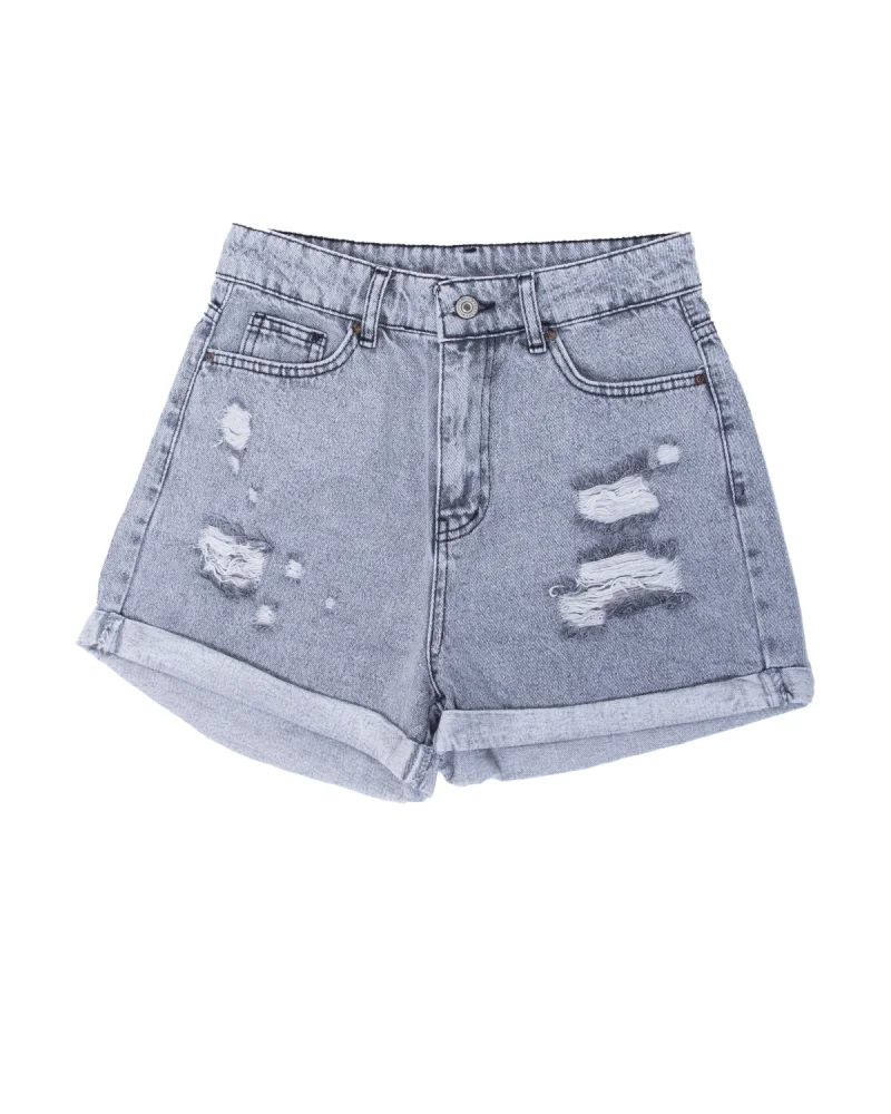 Yırtmaç Paça Detaylı Gri Denim Mini Şort