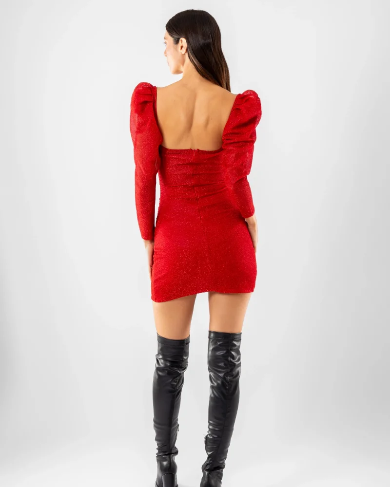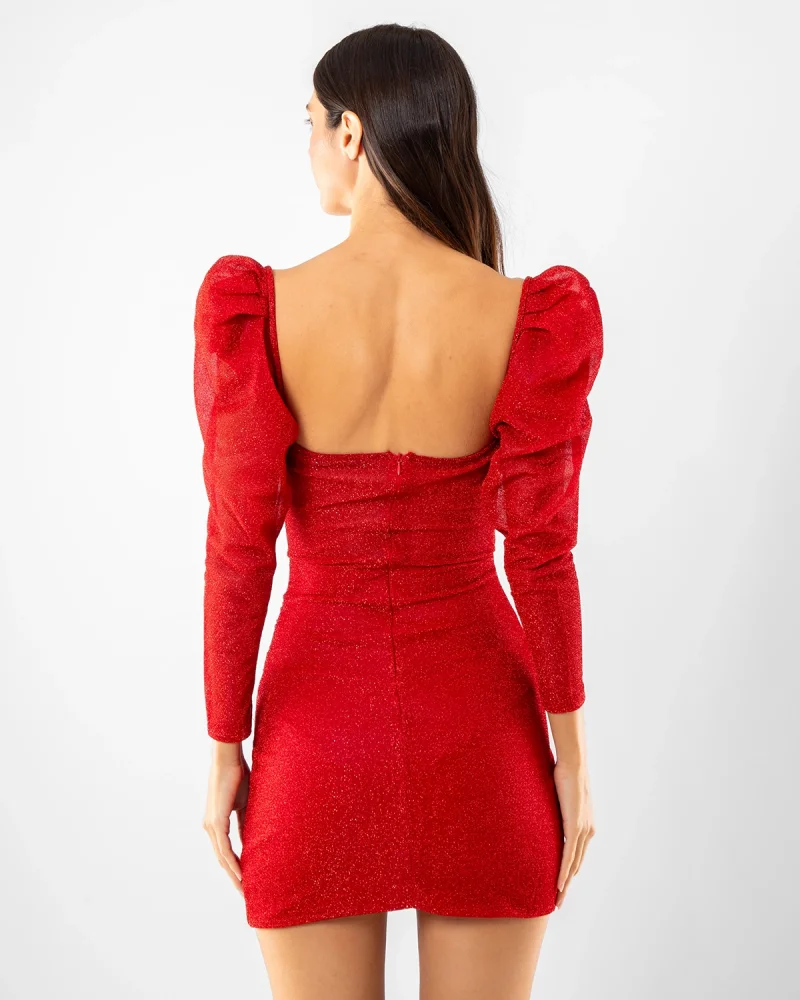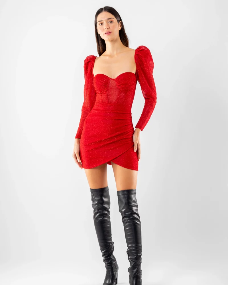 Balon Kol Gloplu Sim Detaylı Kırmızı Mini Elbise