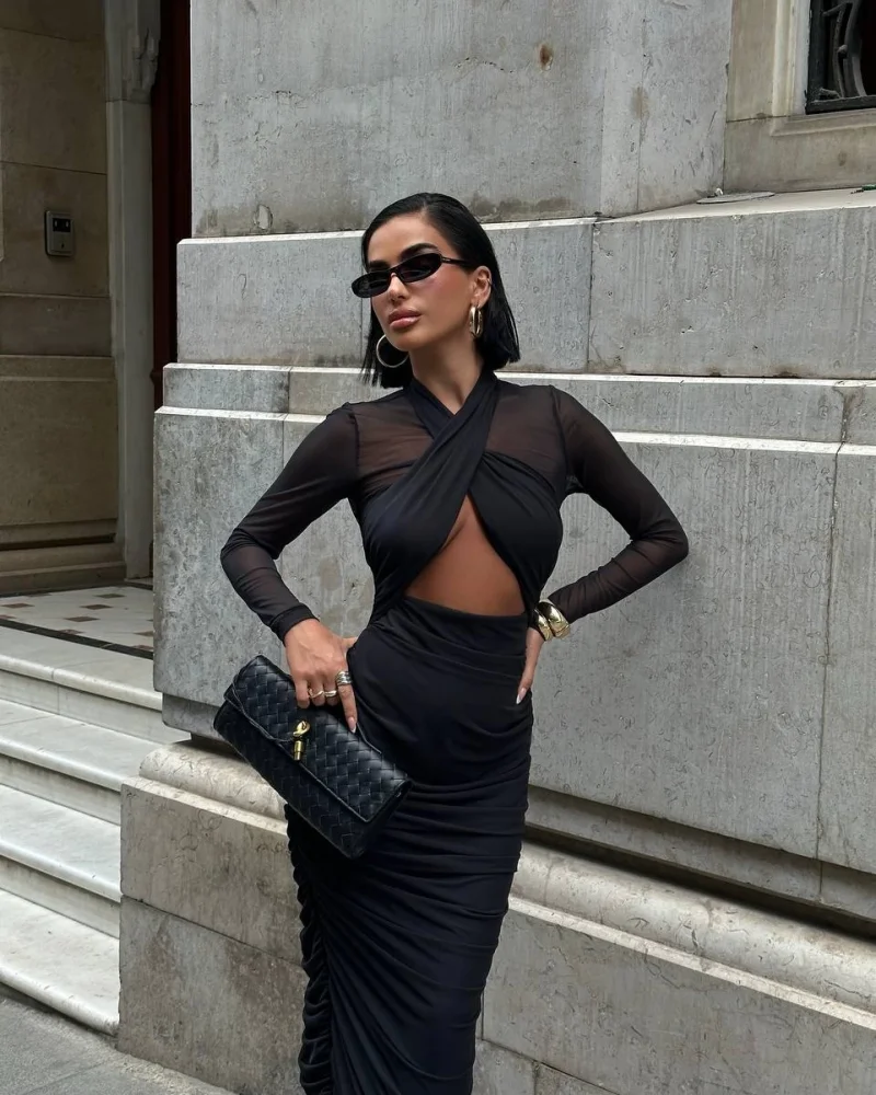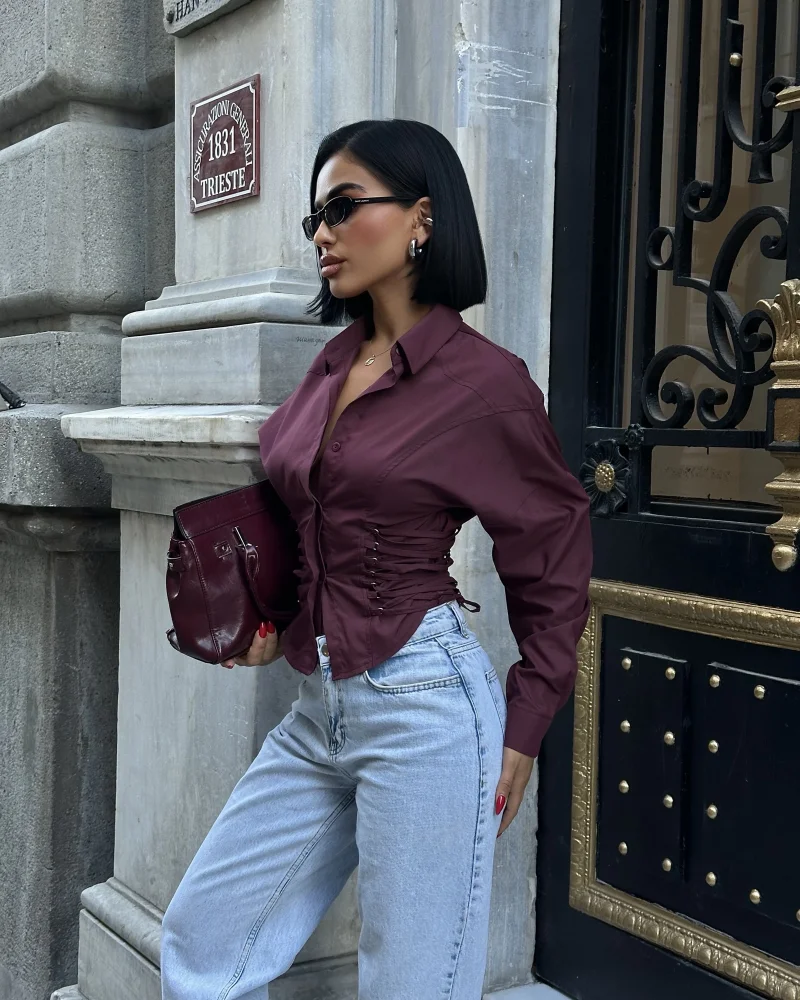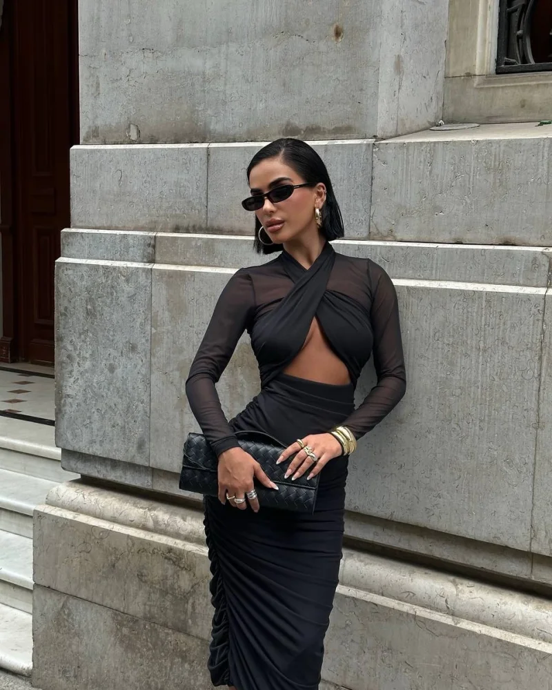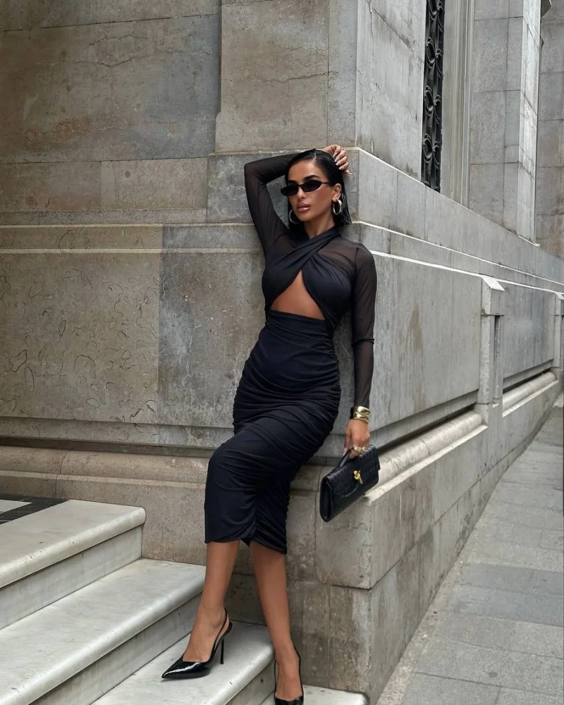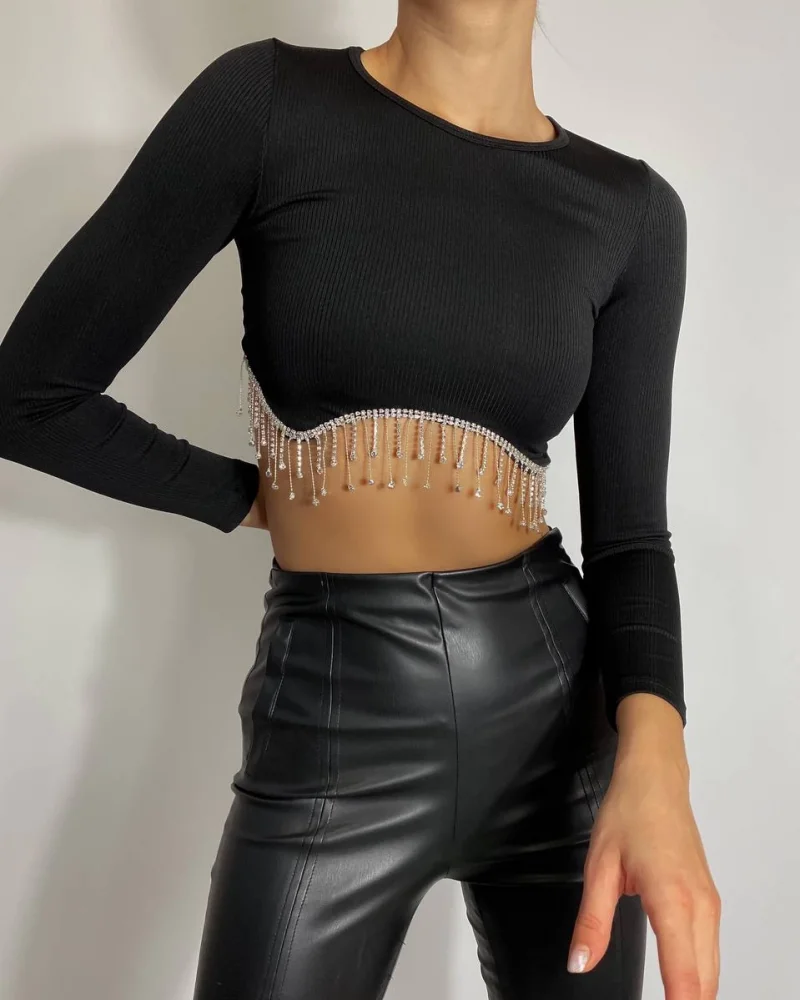 Zincir Detaylı Fitilli Uzun Kollu Siyah Crop