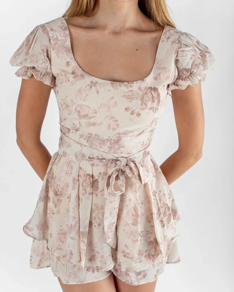Çiçek Desenli Sırt Dekolteli Garneli Şortlu Ekru Mini Elbise