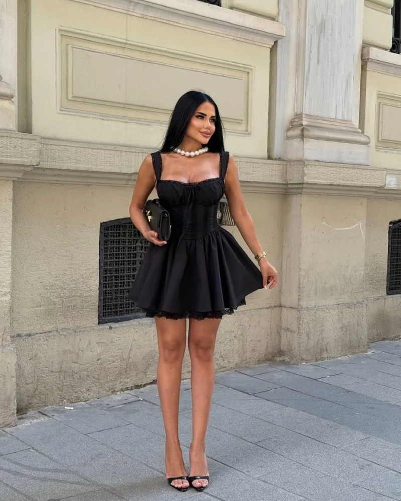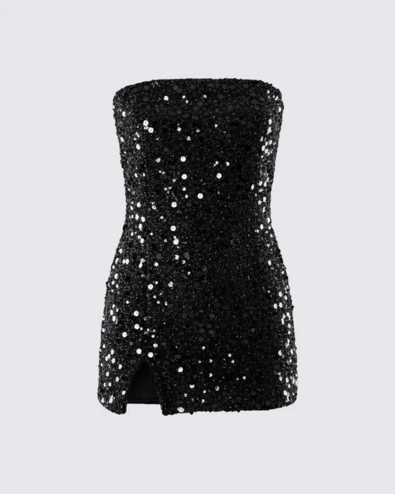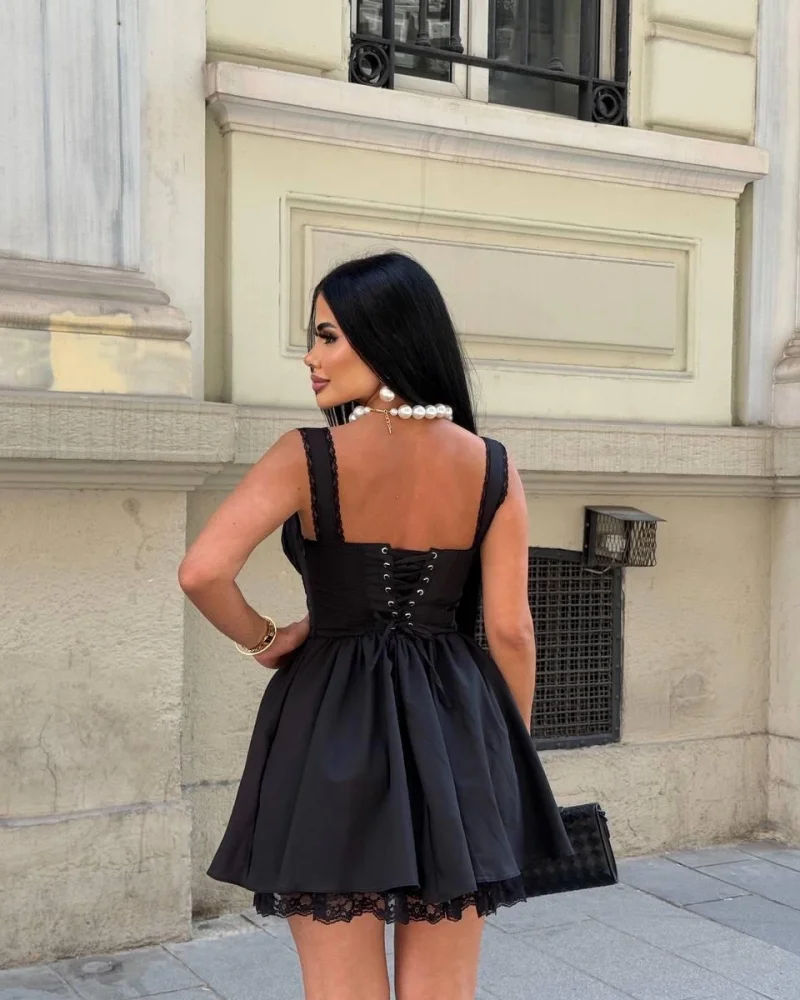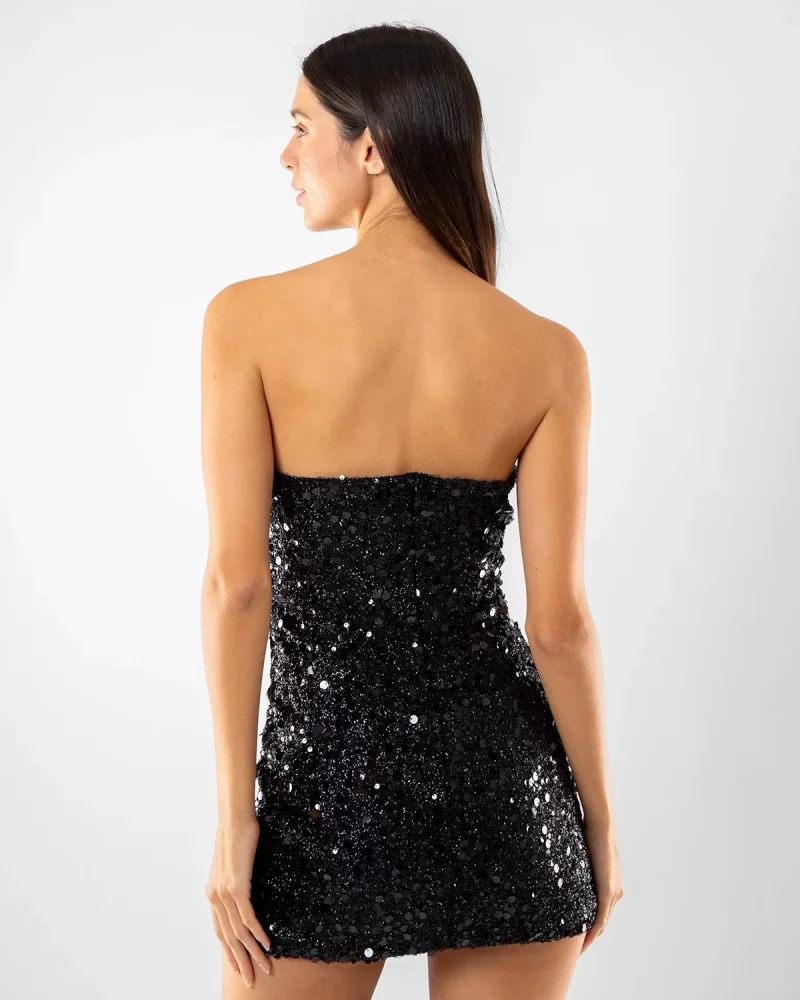 Siyah Payetli Kuş Tüyü Detaylı Askılı Siyah Mini Elbise