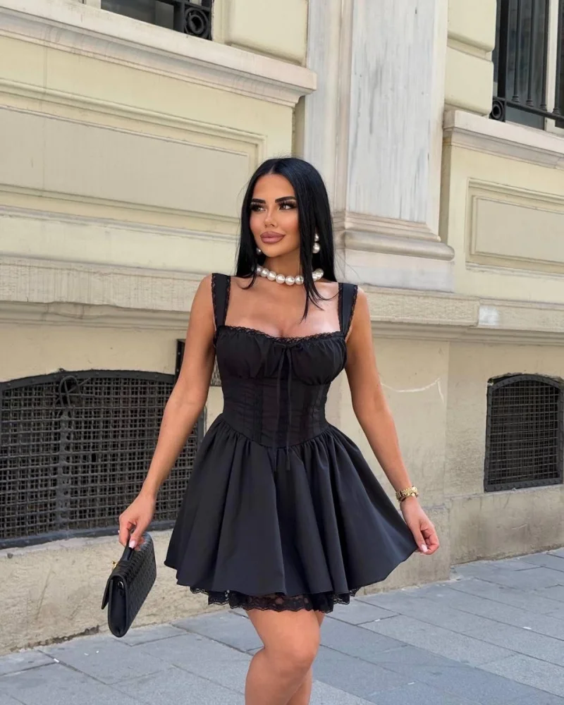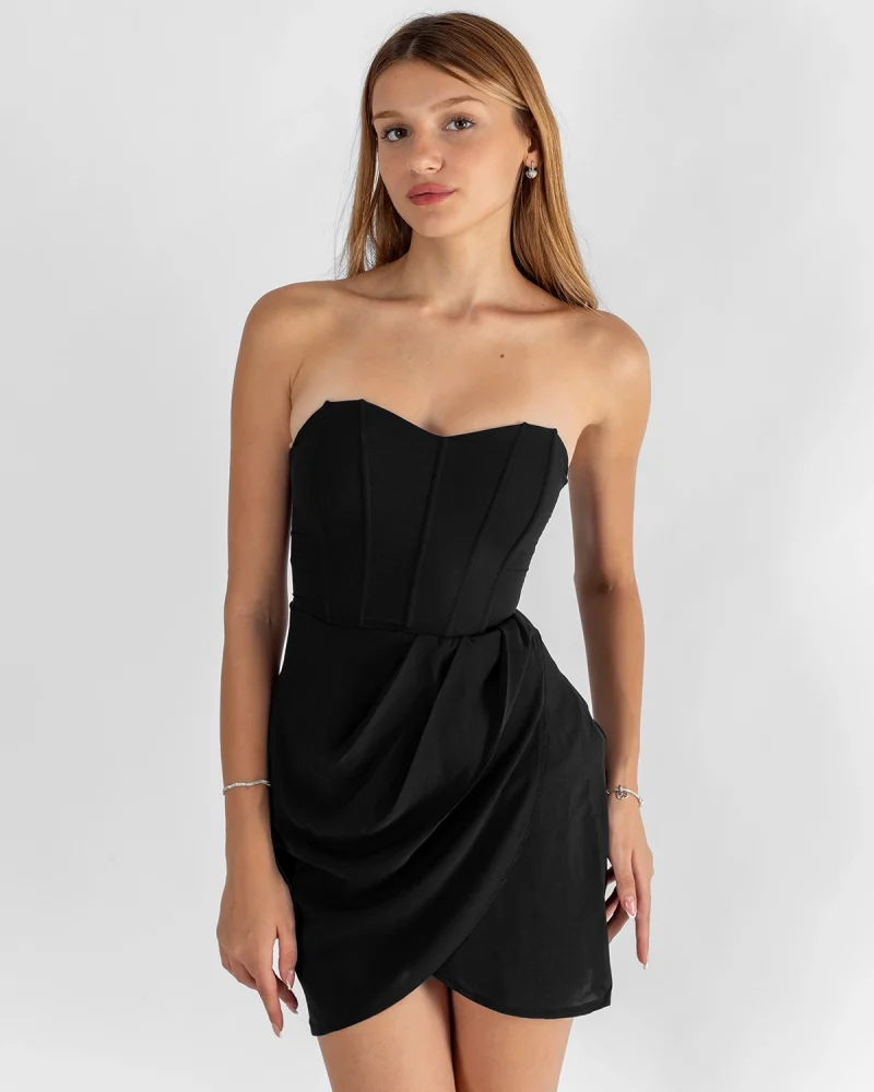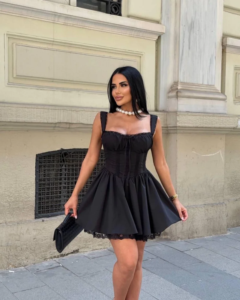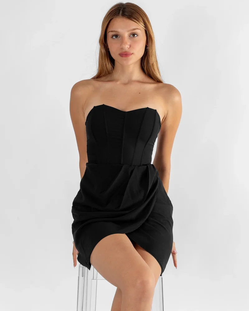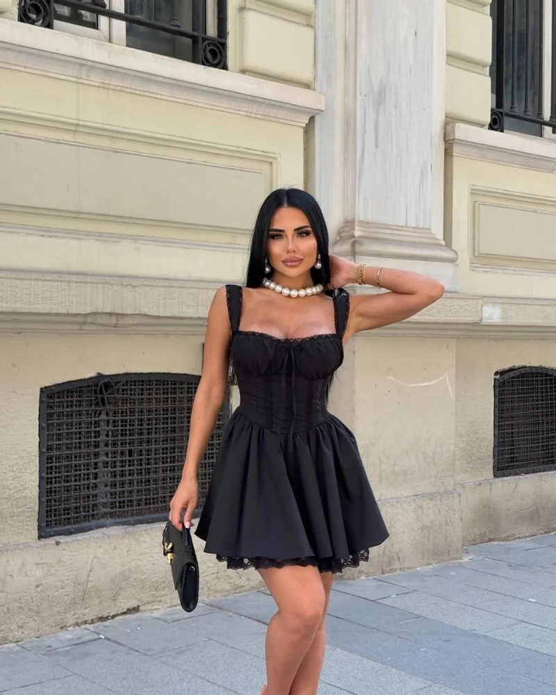 Siyah Payetli Kuş Tüyü Detaylı Askılı Siyah Mini Elbise