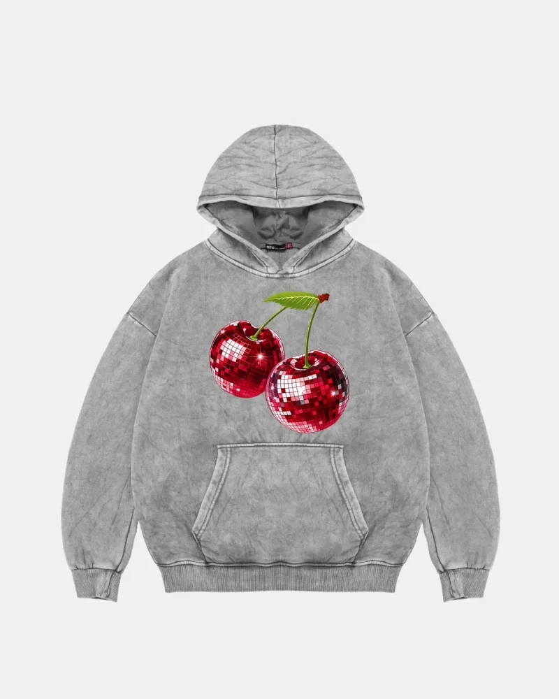 Disco Cherry Baskılı Kadın Yıkamalı Beyaz Hoodie