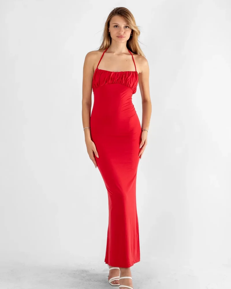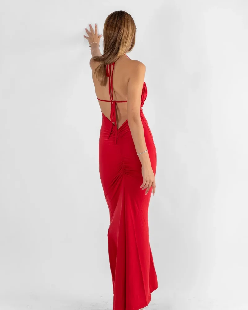 Sırt Dekolteli Asklı Midi Boy Kırmızı Elbise