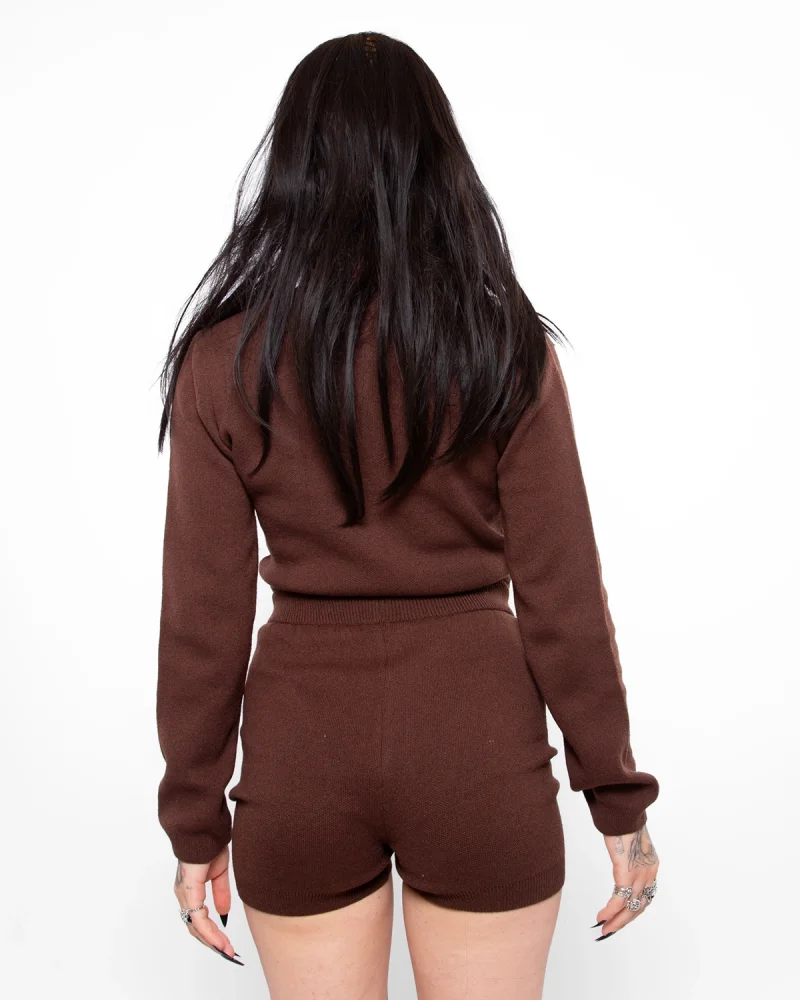 Fermuar Detaylı Kısa Kol Mini Kahverengi Tulum