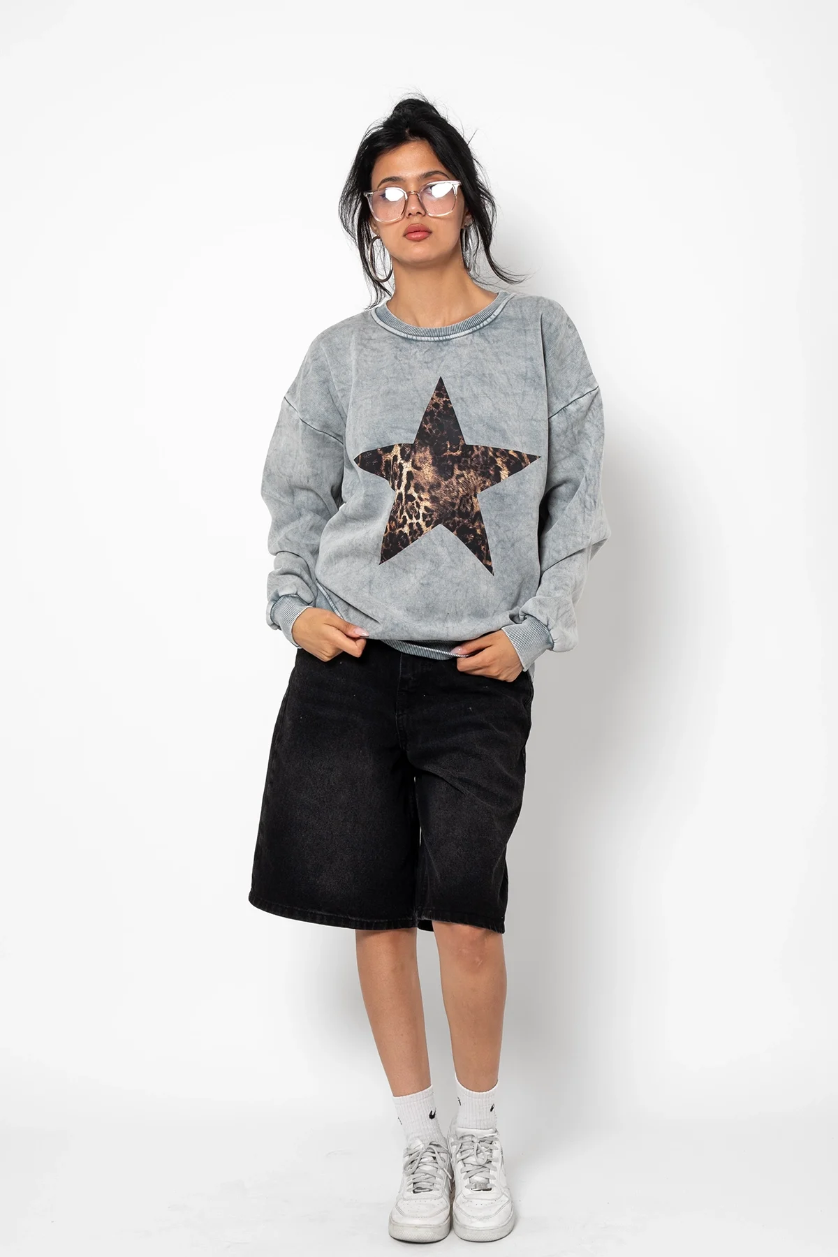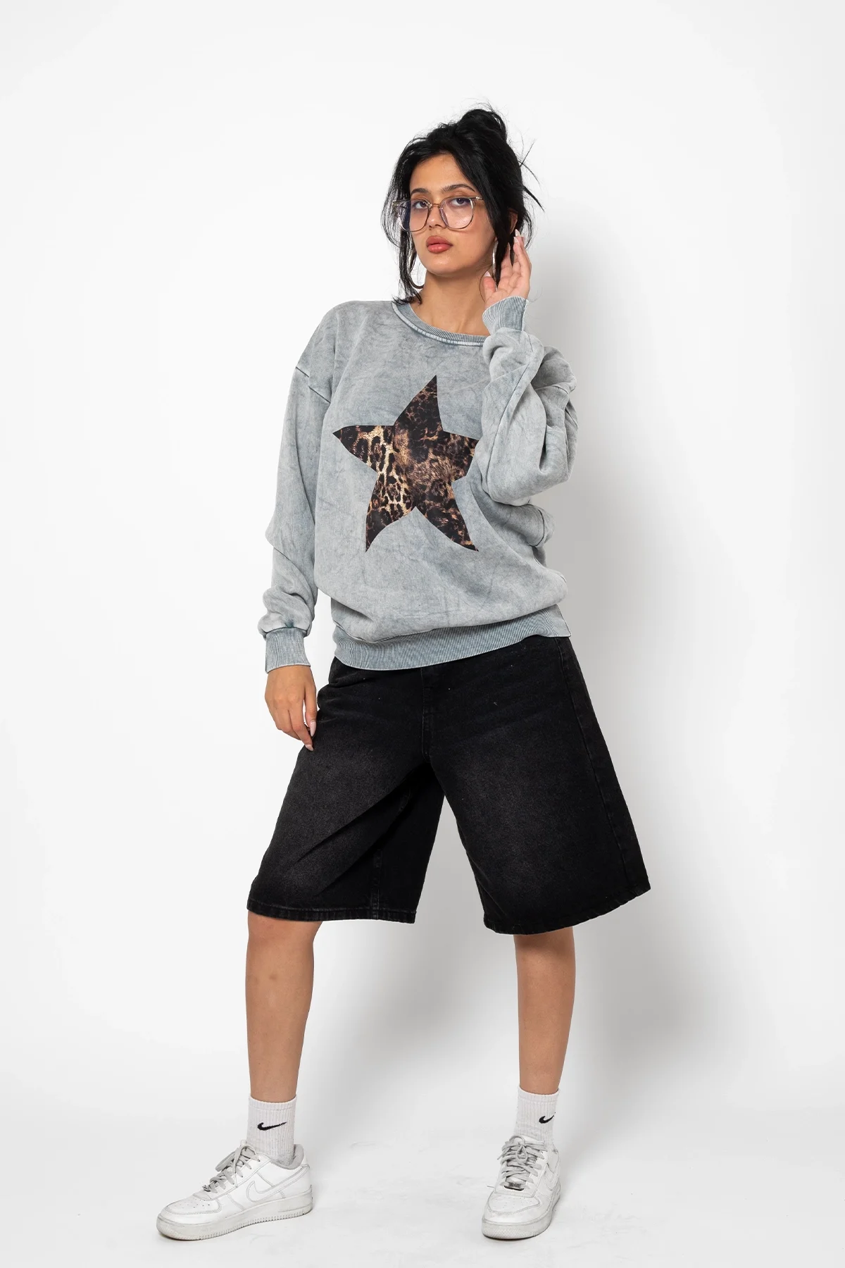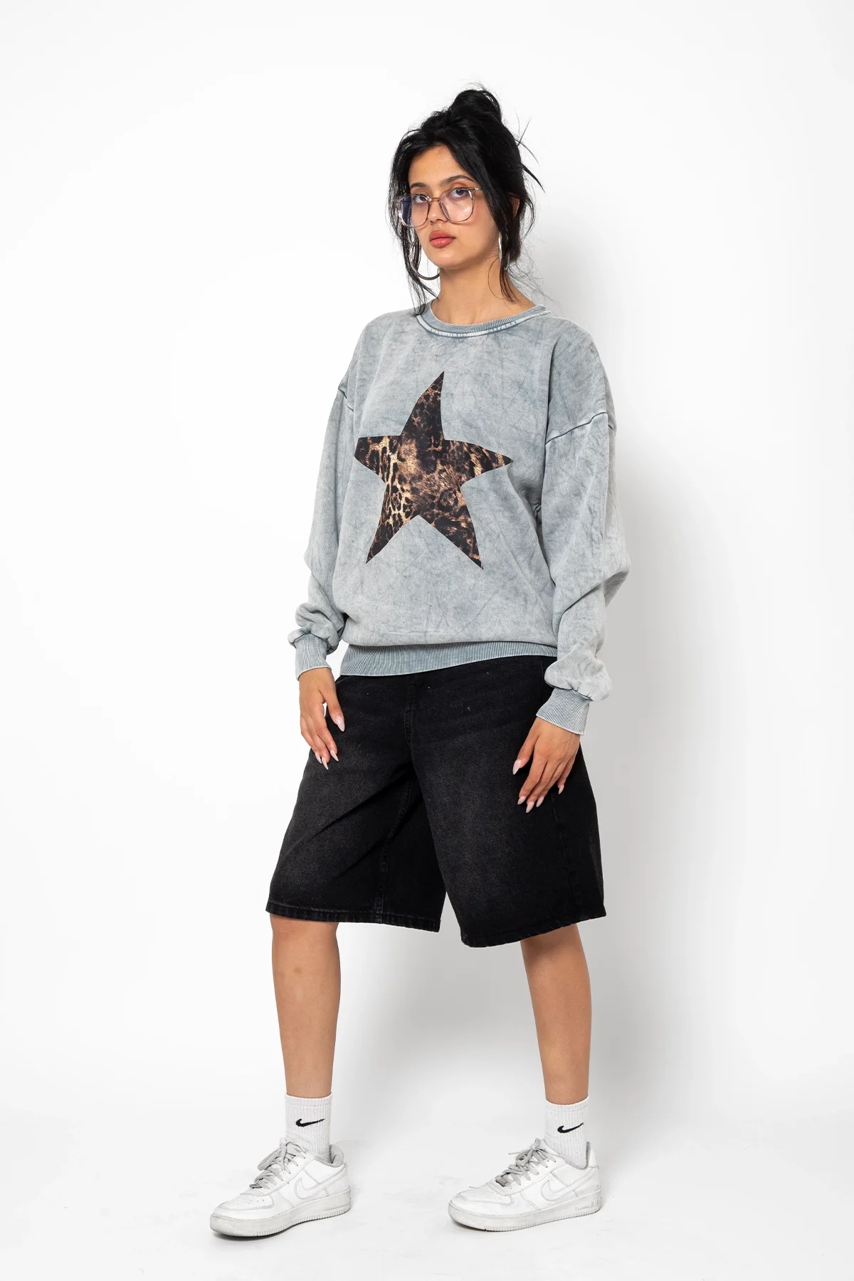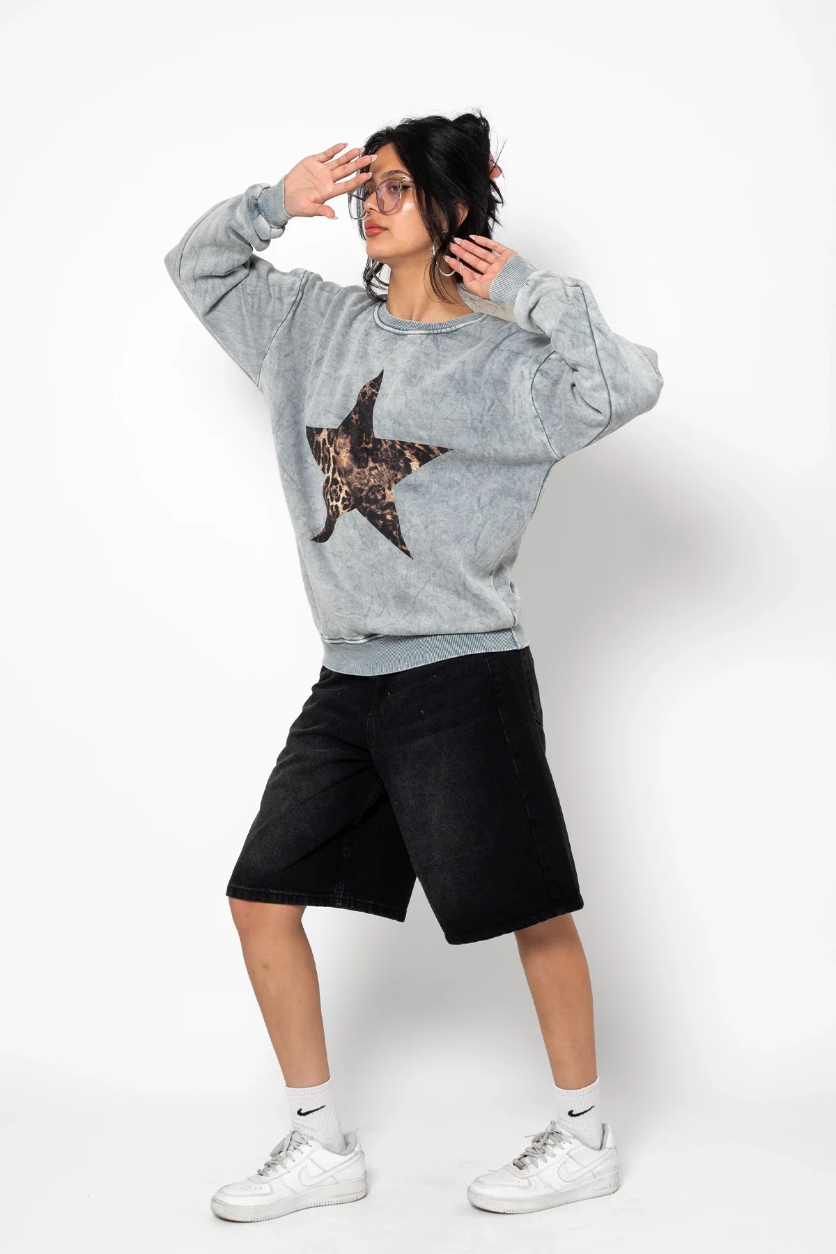 STARZ LEOPAR BASKILI YIKAMALI BEYAZ OVERSİZE UNİSEX SWEATSHİRT