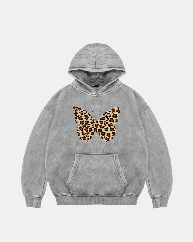 Butterfly Leopard Baskılı Oversize Unisex Premium Yıkamalı Beyaz Hoodie