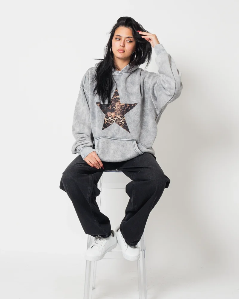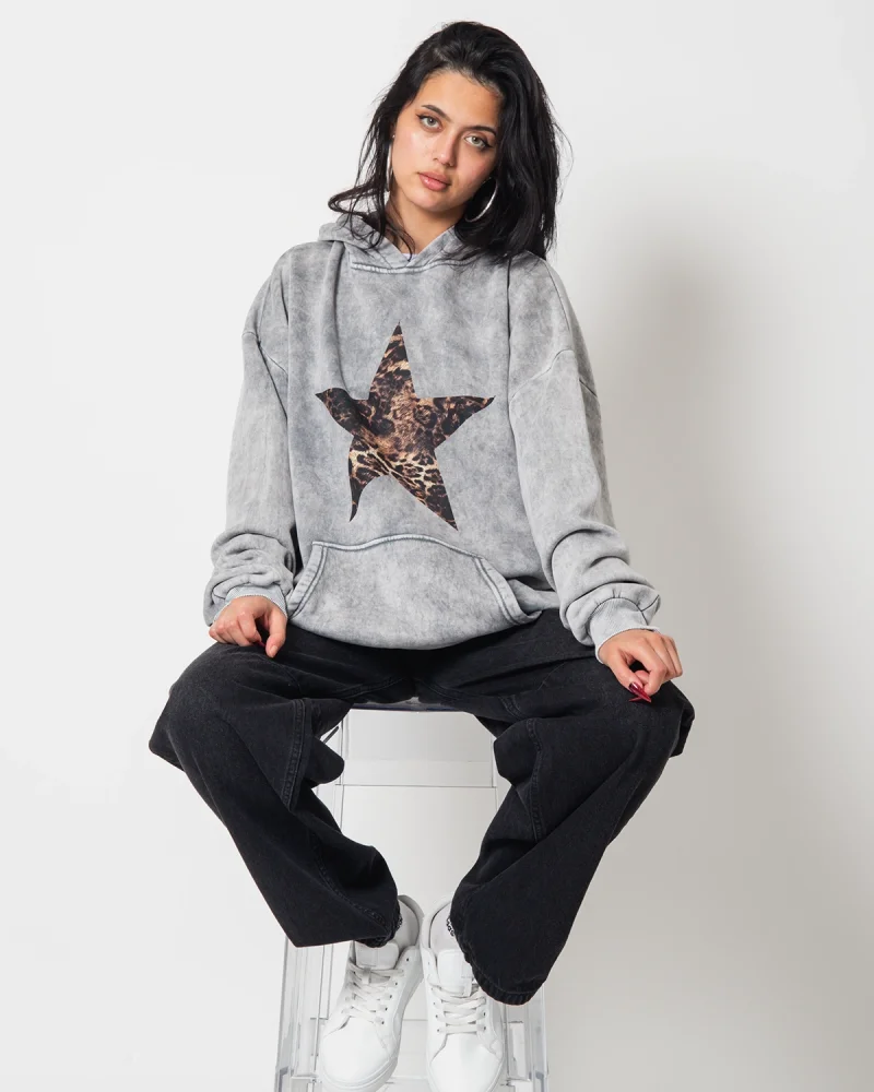 Leopar Starz Baskılı Oversize Unisex Premium Yıkamalı Beyaz Hoodie