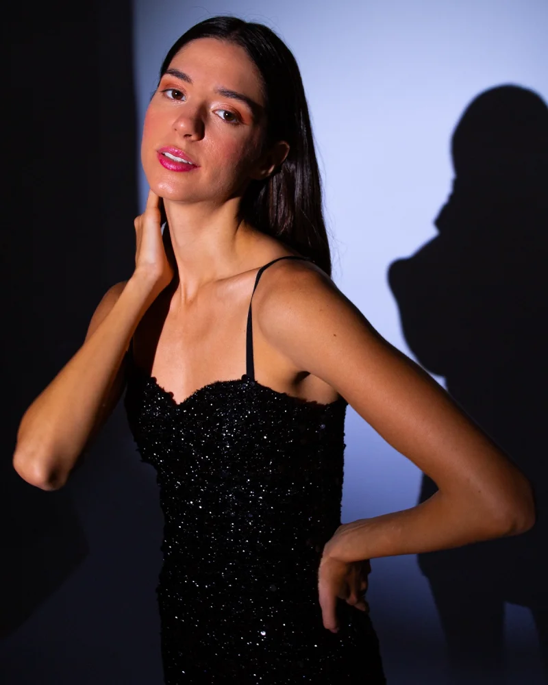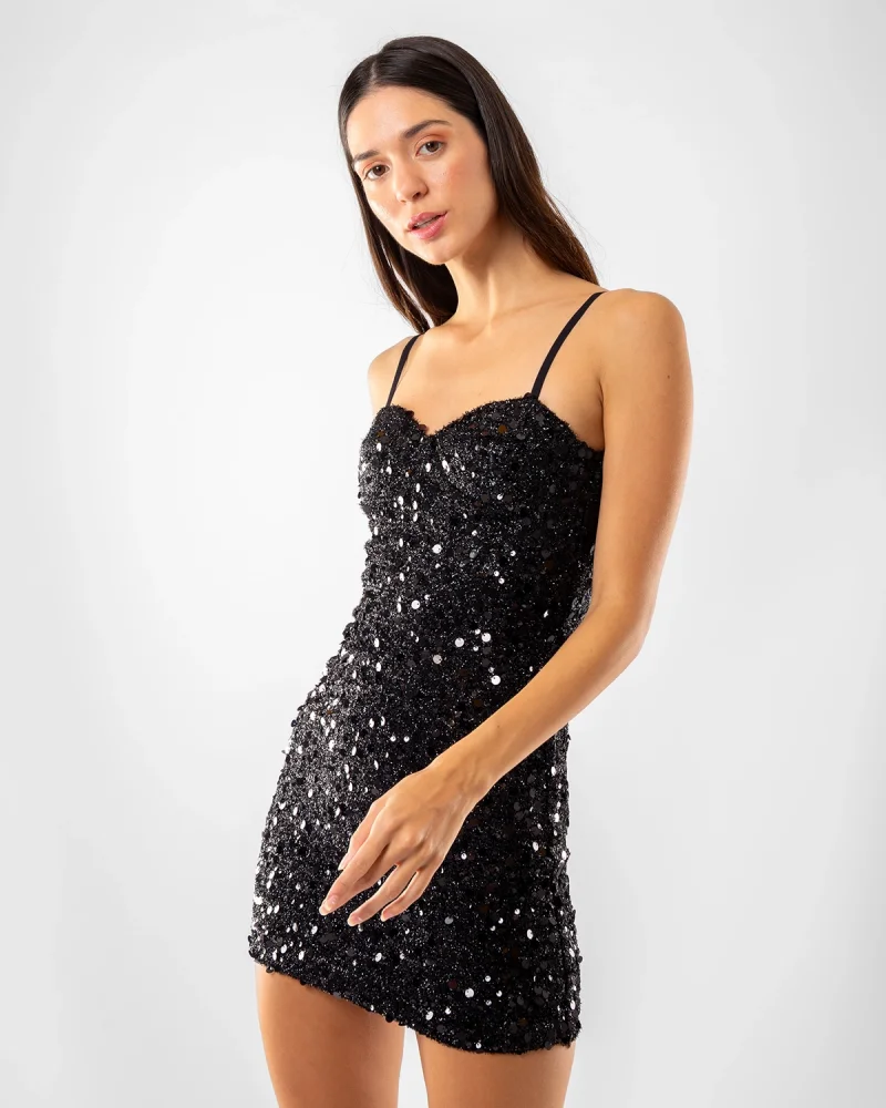 Siyah Payetli Kuş Tüyü Detaylı Askılı Siyah Mini Elbise