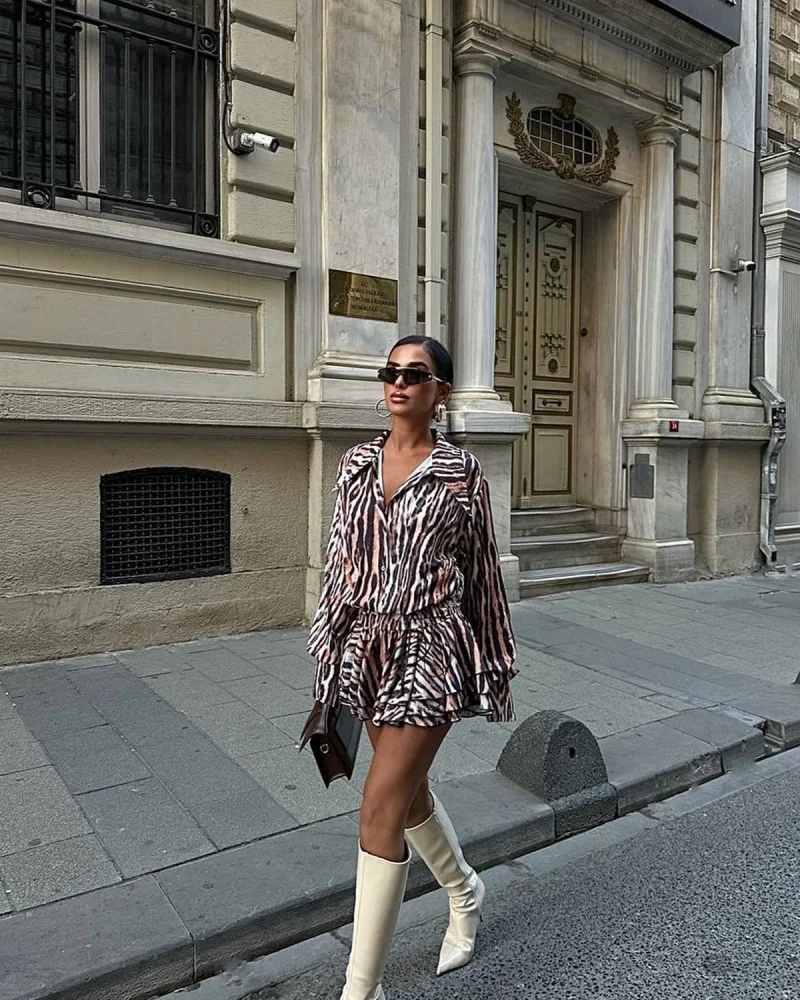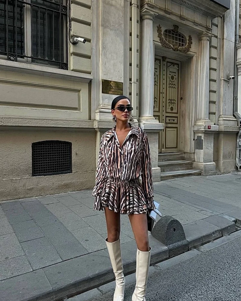 Ön Fermuar Detaylı Bele Oturan Ekru Elbise