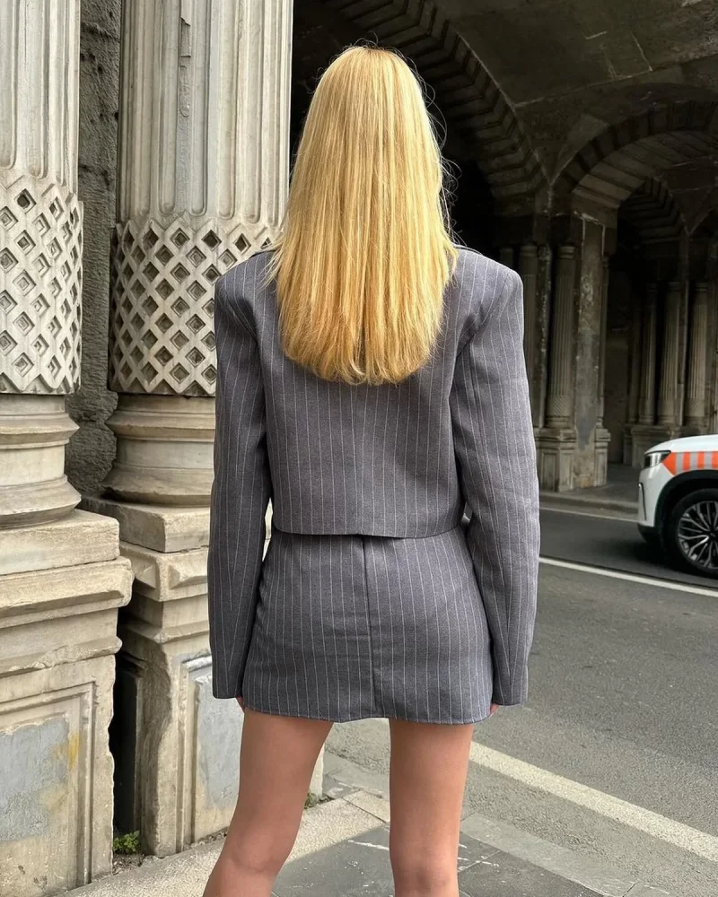 Çizgili Kravatlı Yırtmaç Detaylı Gri Ceket Takım