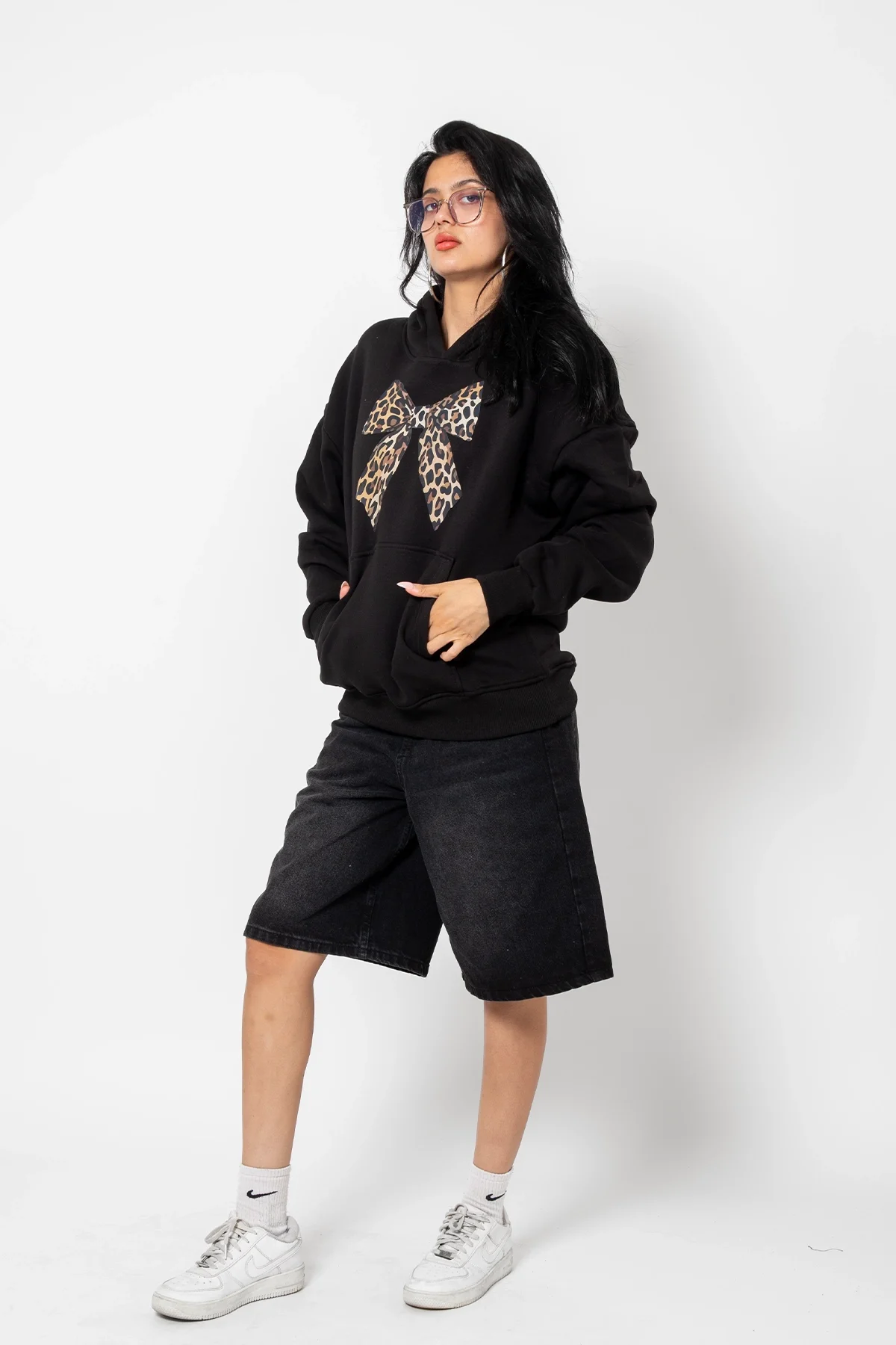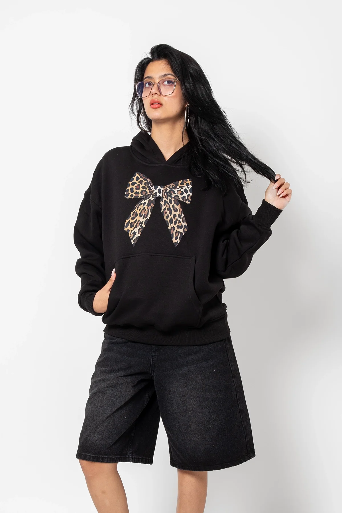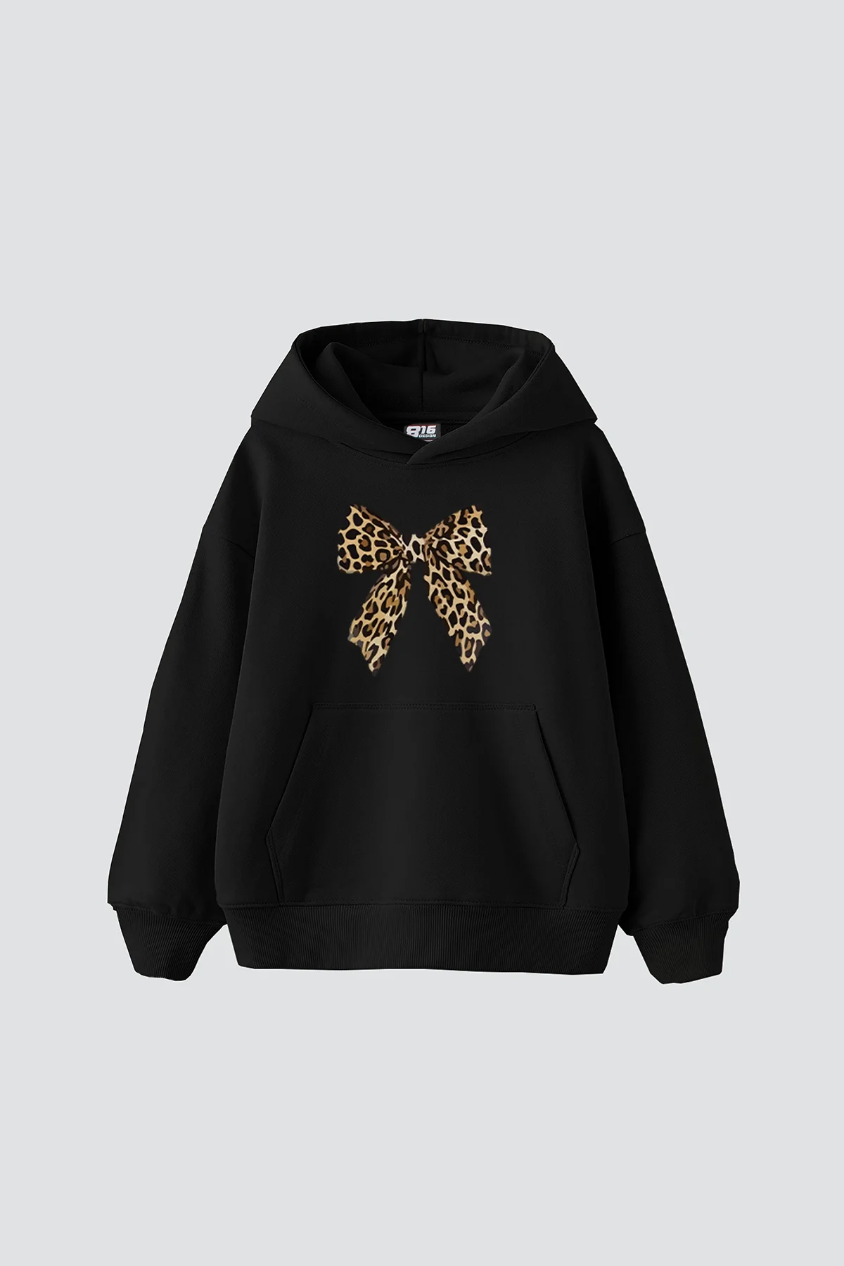 FİYONK LEOPAR BASKILI OVERSİZE UNİSEX PREMİUM SİYAH HOODİE