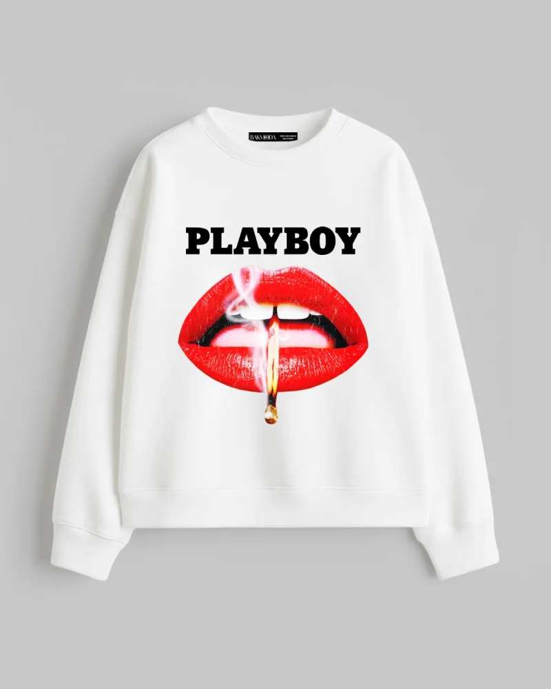 Playboy Baskılı Kapüşonsuz Relaxed Fit Kadın Beyaz Sweatshirt
