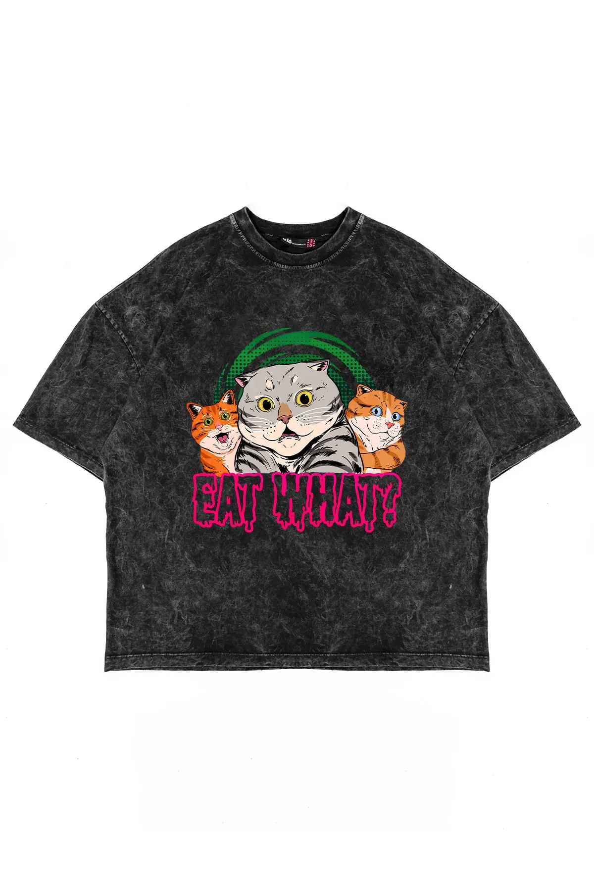 EAT WHAT CAT BASKILI OVERSİZE UNİSEX YIKAMALI SİYAH TSHİRT