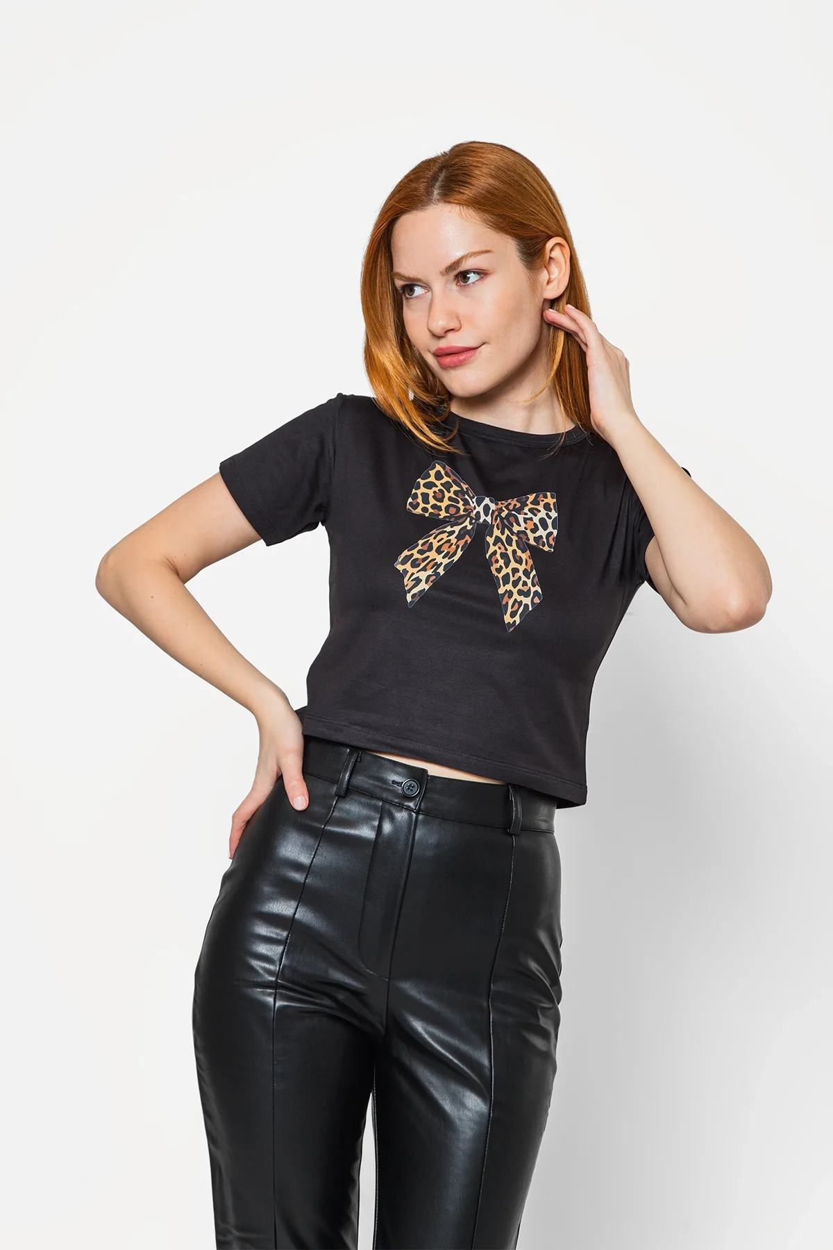FİYONK LEOPAR BASKILI SİYAH CROP TOP
