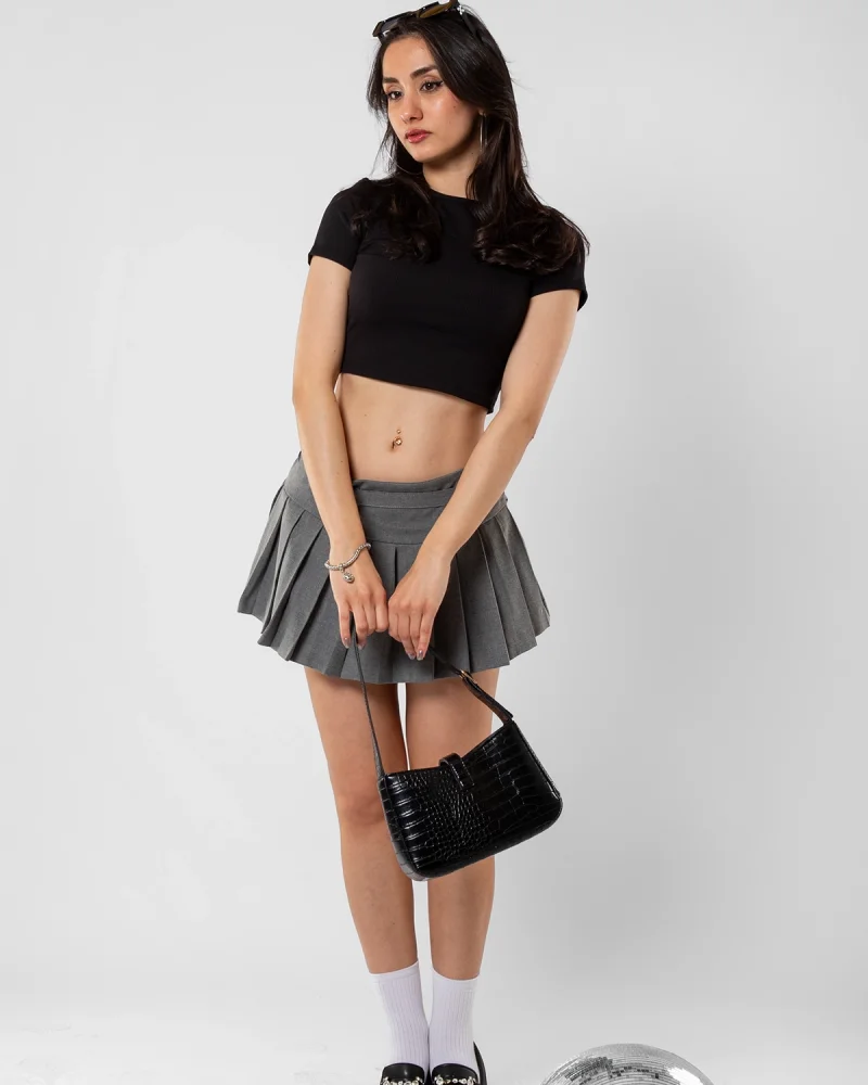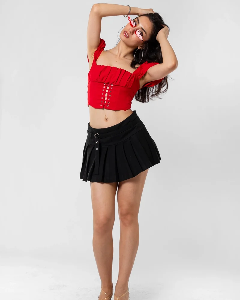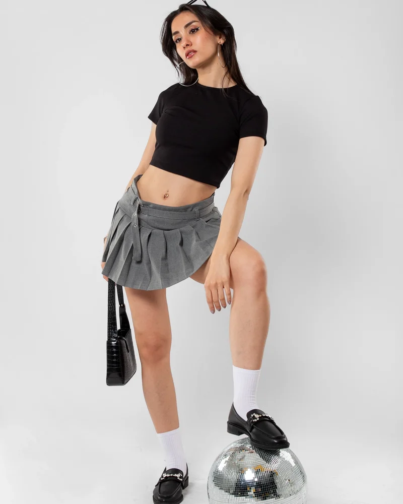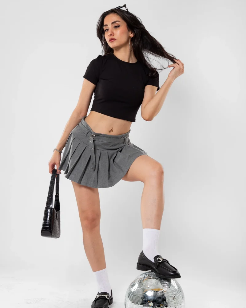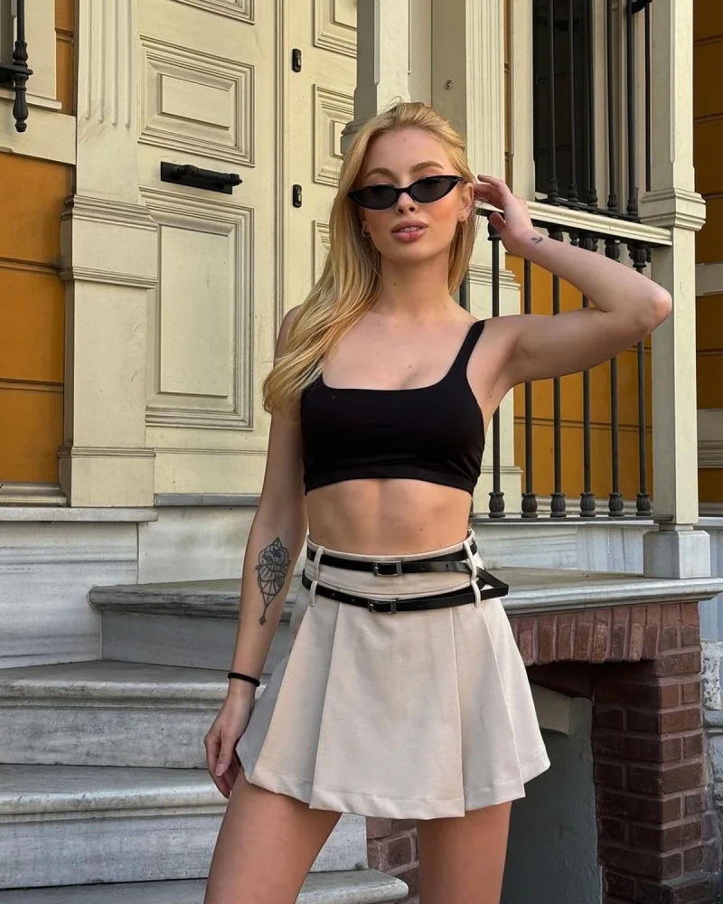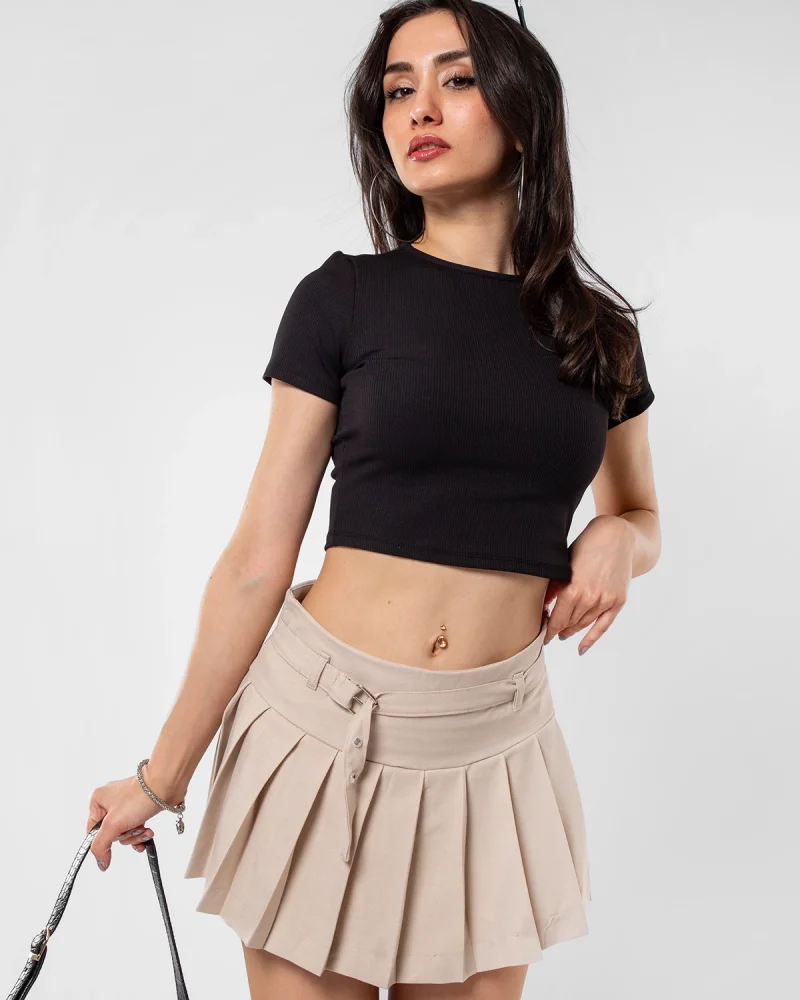 Çift Kemer Detaylı Pileli Bej Şort Etek