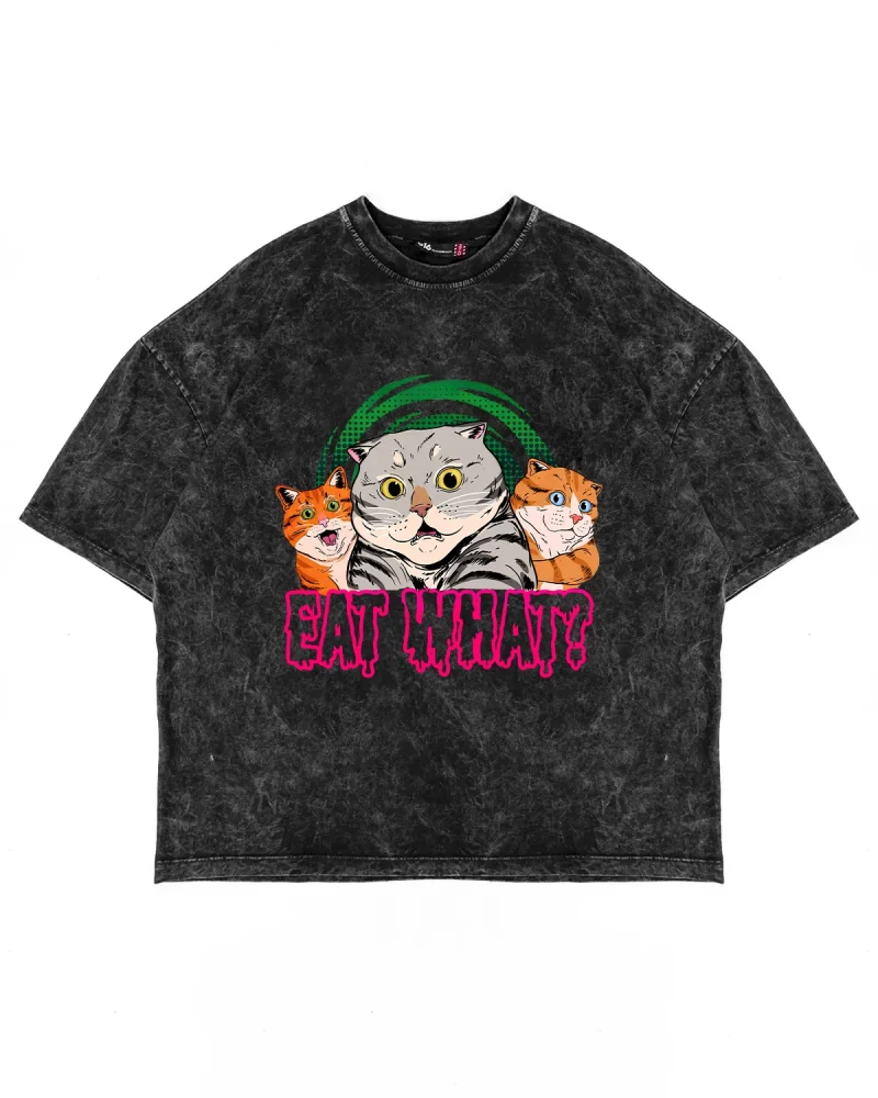 Eat What Cat Baskılı Oversize Unisex Yıkamalı Siyah Tshirt
