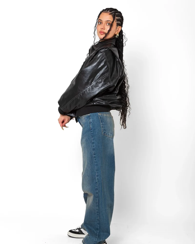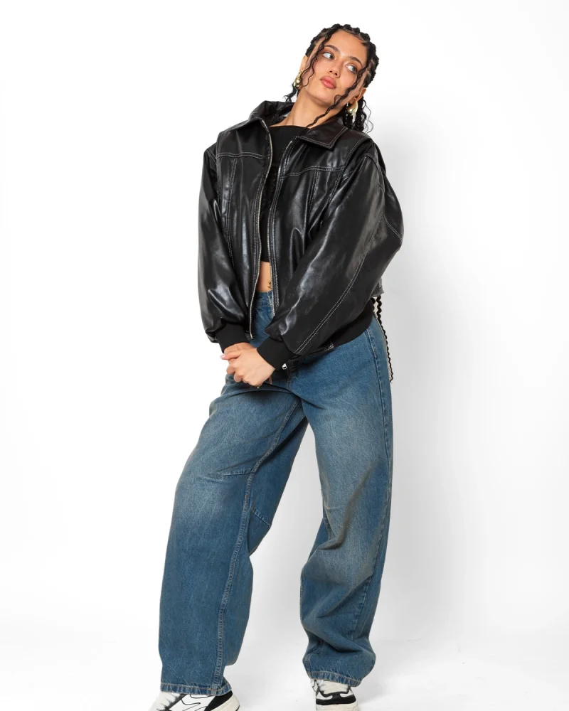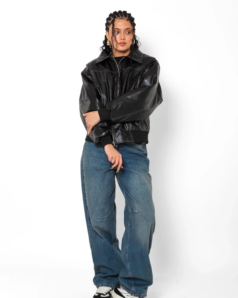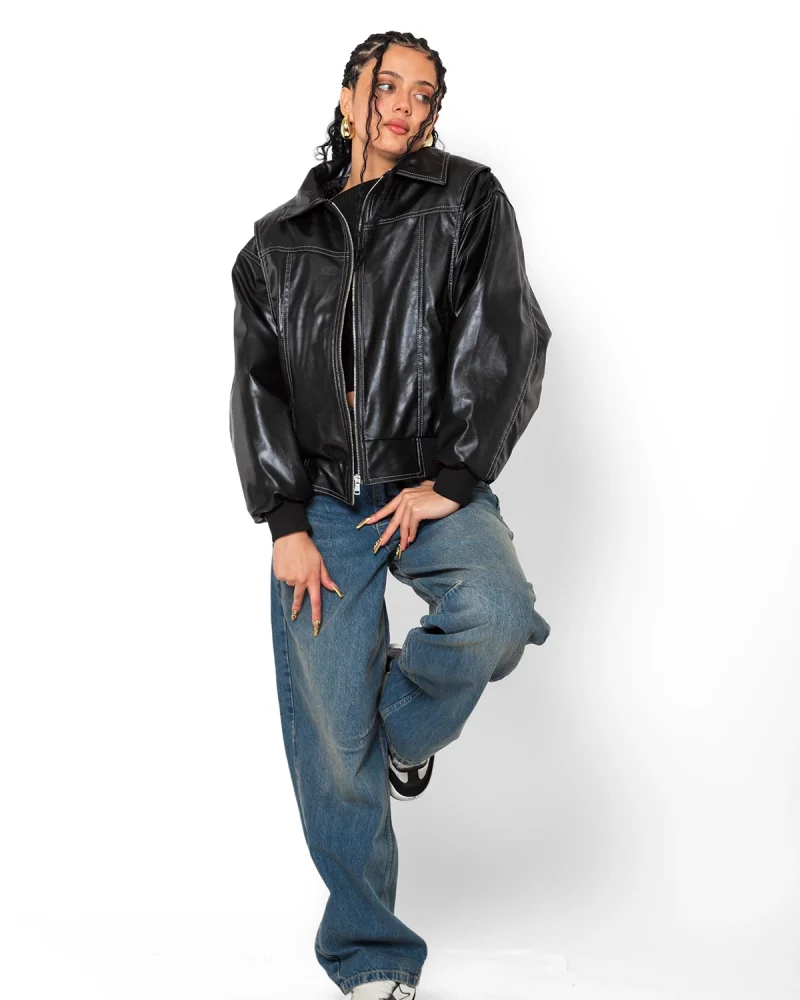 Dikiş Detaylı Fermuarlı Deri Ceket