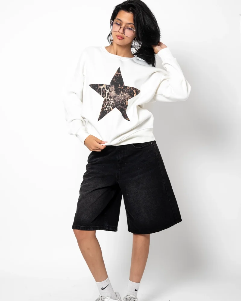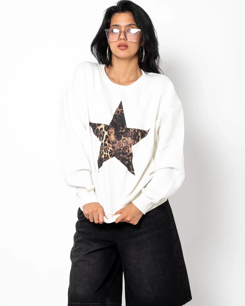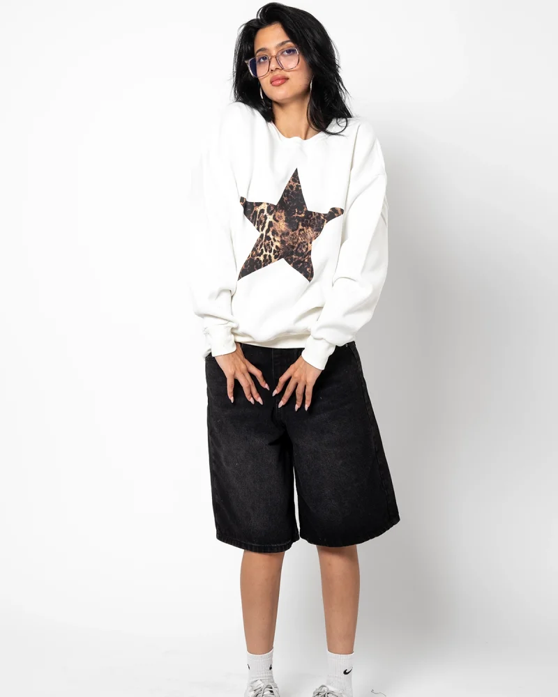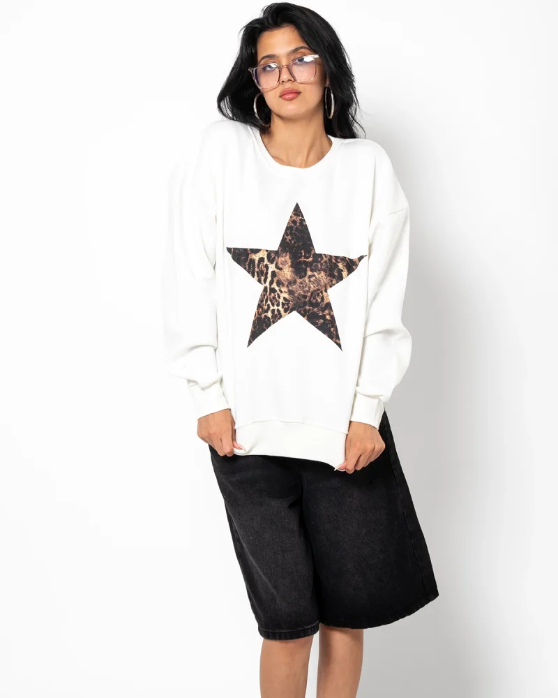 Starz Leopar Baskılı Beyaz Oversize Unisex Sweatshirt