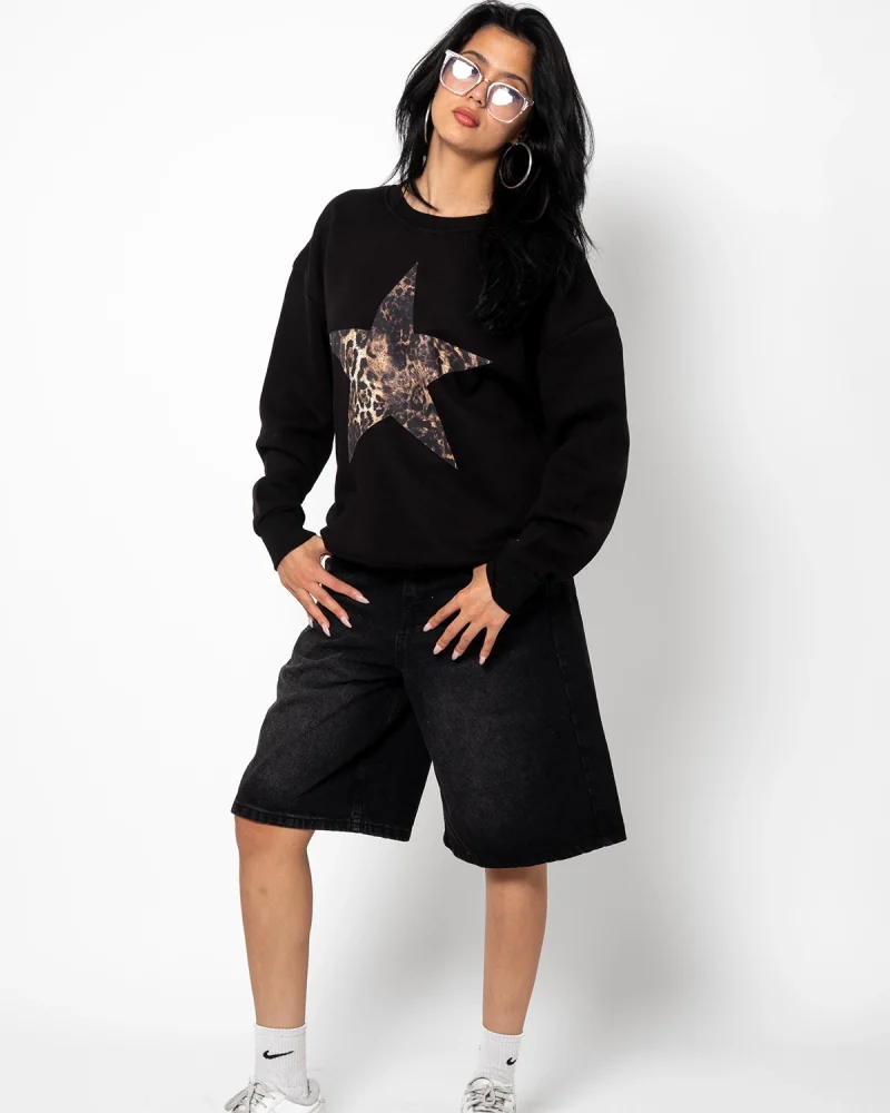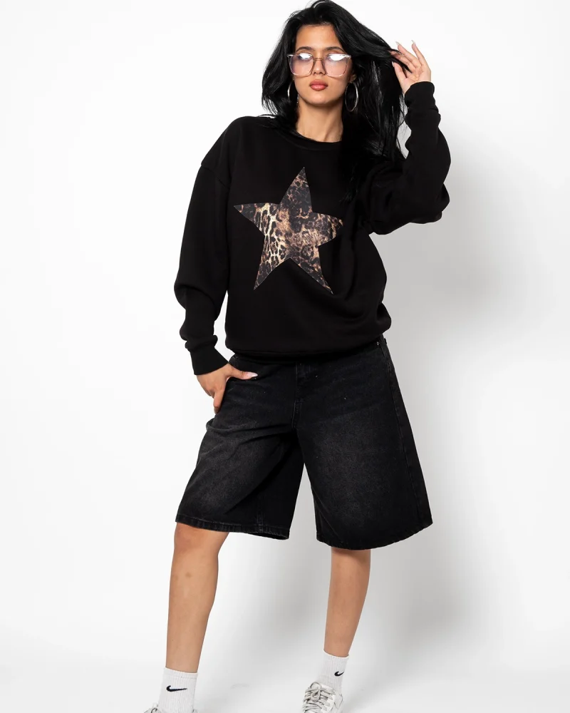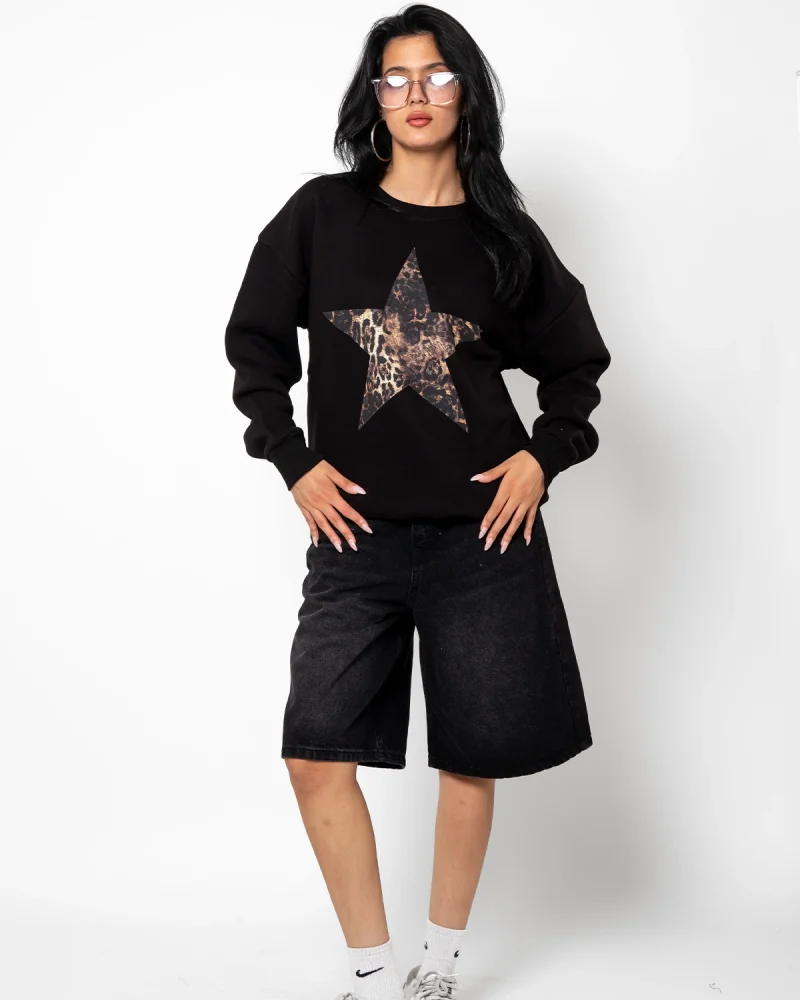 Starz Leopar Baskılı Siyah Oversize Unisex Sweatshirt