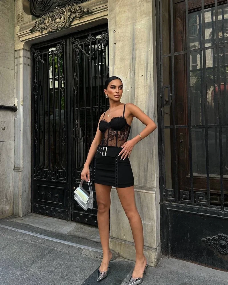 Degaje Yaka İp Askılı Sırt Dekolteli Siyah Mini Elbise