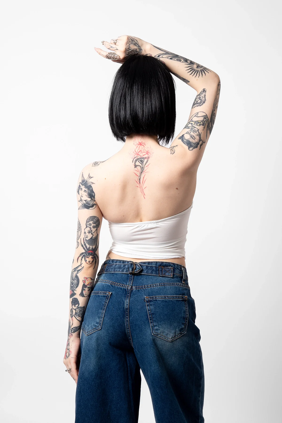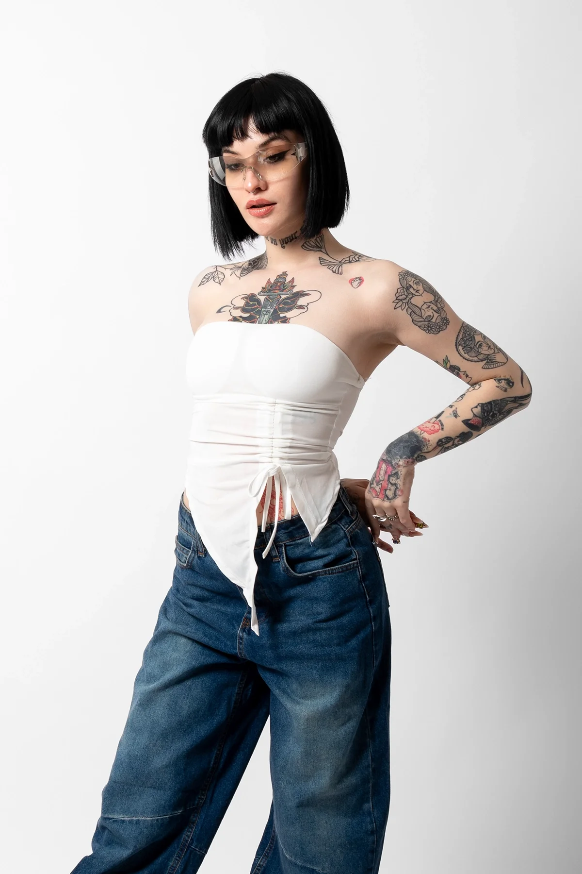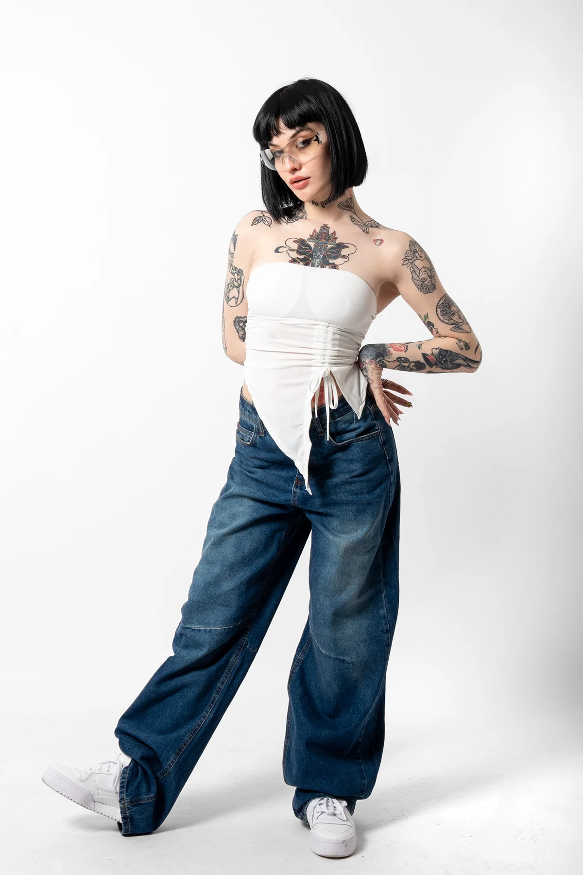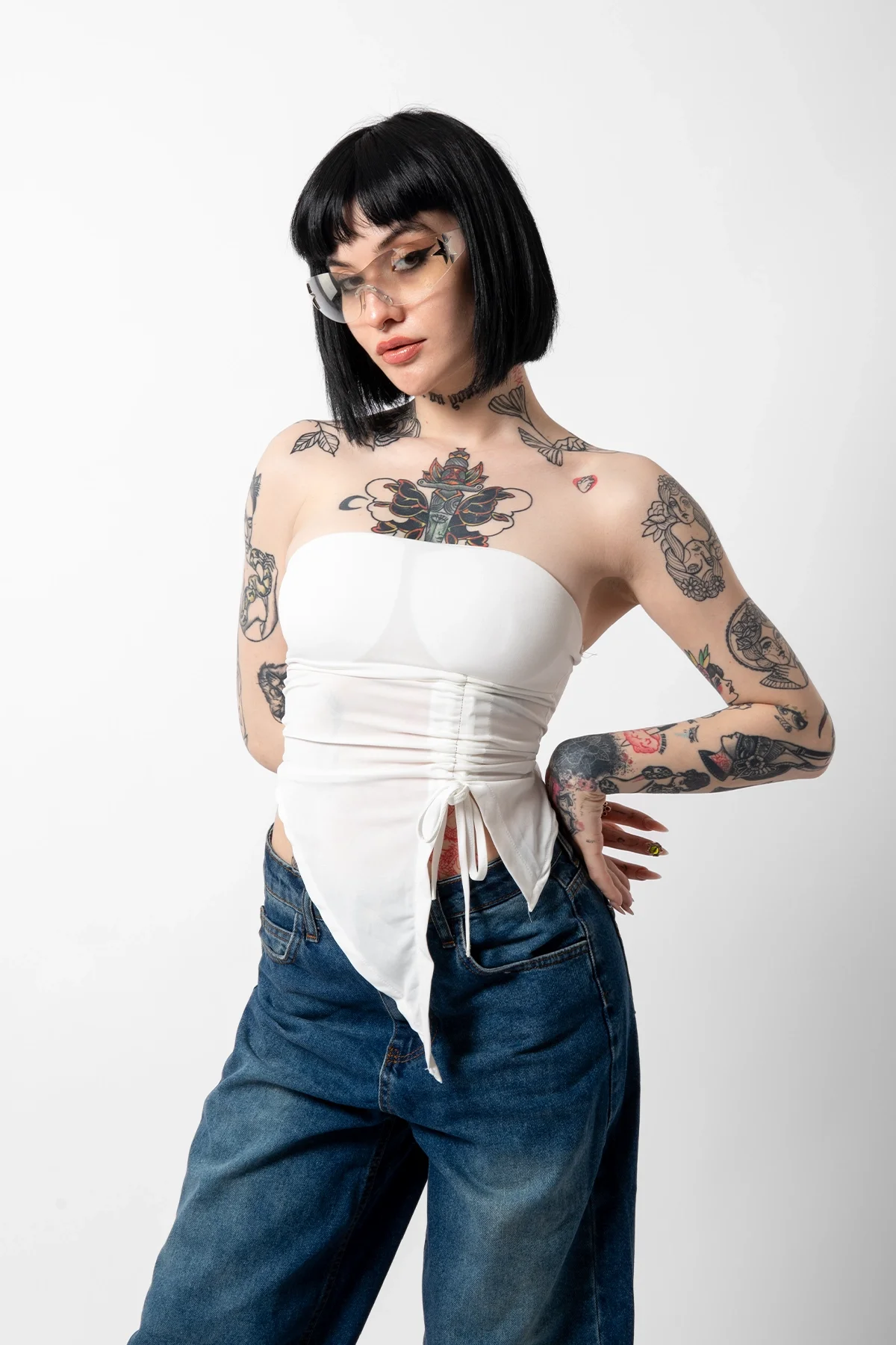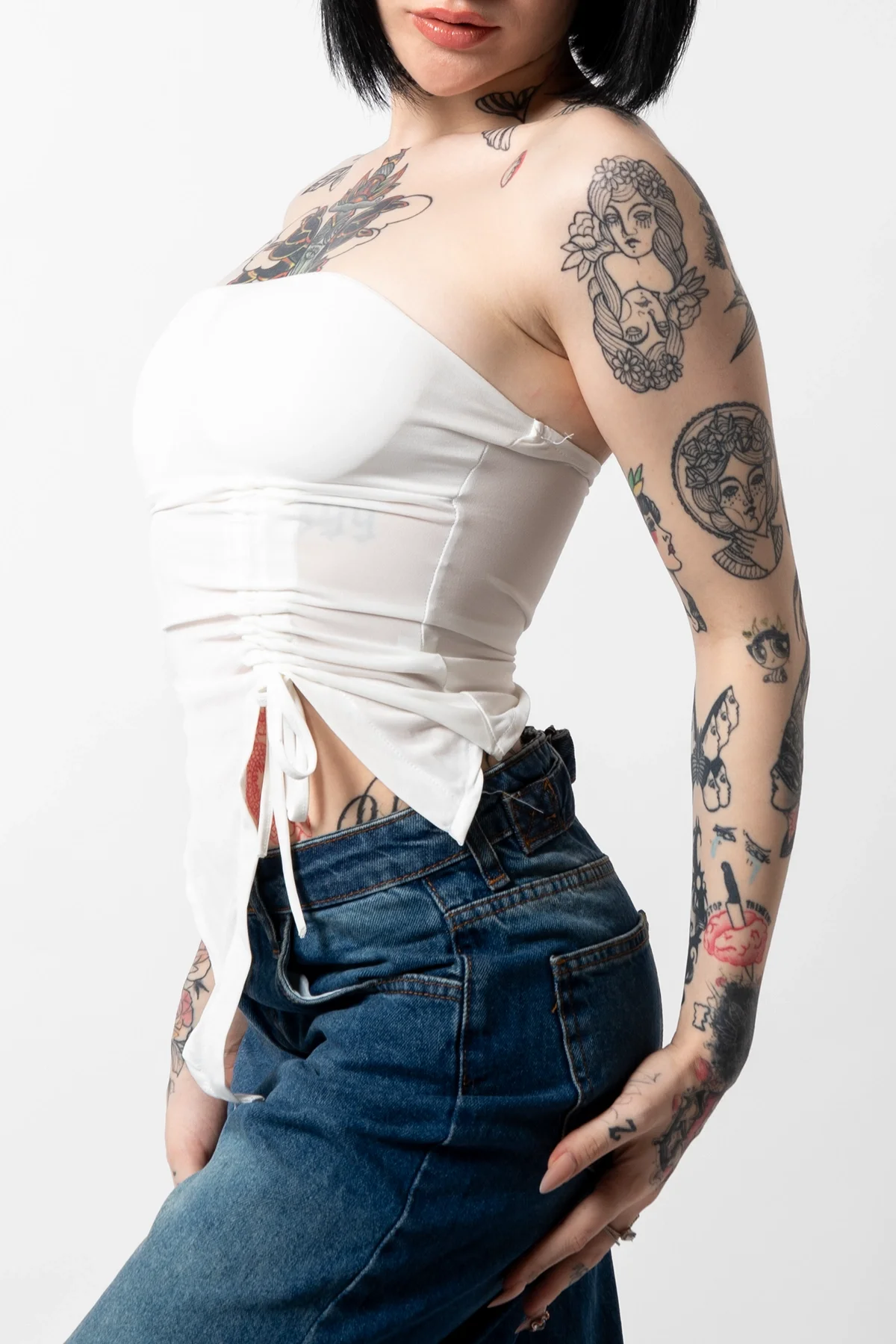 Tarzınızı ön plana çıkaracak modern ve şık bir görünüm için tasarlanan Yan Büzgülü İp Detaylı Beyaz Crop, gardırobunuzun vazgeçilmez parçalarından biri olmaya aday.
