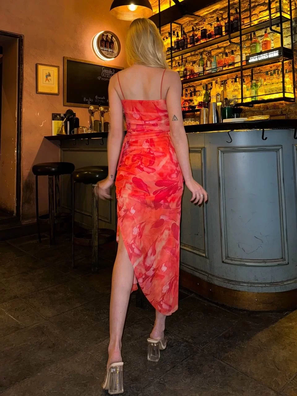 İnce askıları ve belden aşağıya hareketli volanlarla tamamlanan tasarımı, vücut hatlarını nazikçe sararken aynı zamanda özgürce hareket etmenizi sağlar. Gün batımı davetlerinden yaz düğünlerine, özel akşamlardan tatil stilinize kadar her ortamda şıklığınızı öne çıkarır.