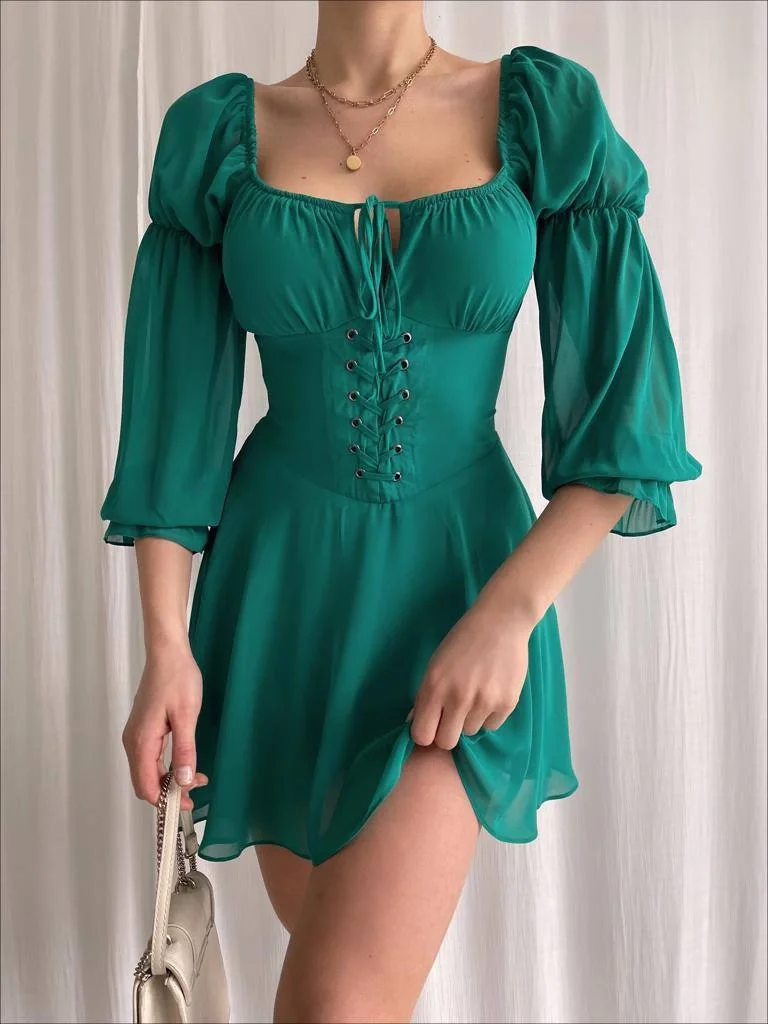 GÖĞÜS BAĞLAMALI UZUN KOLLU İP DETAYLI YEŞİL ELBİSE