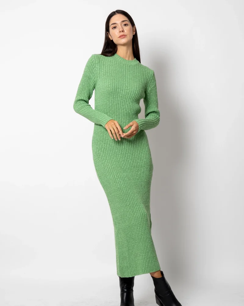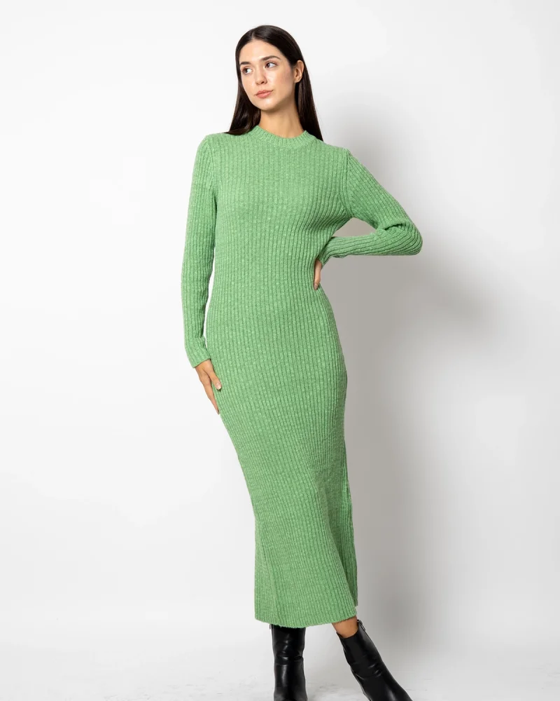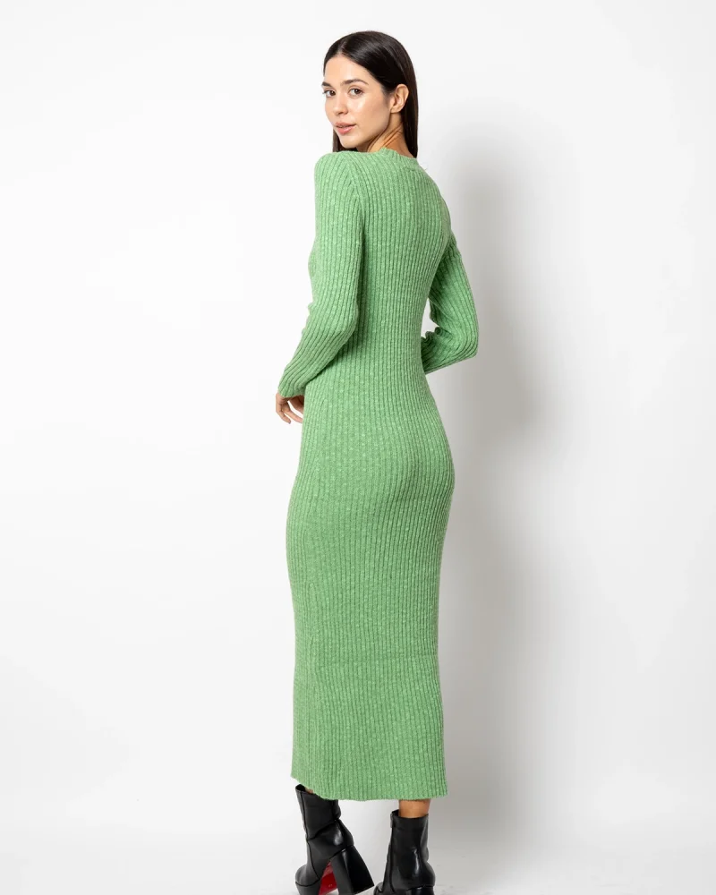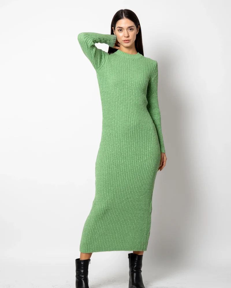 Basic Boğazlı Triko Yeşil Uzun Elbise