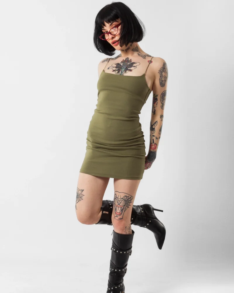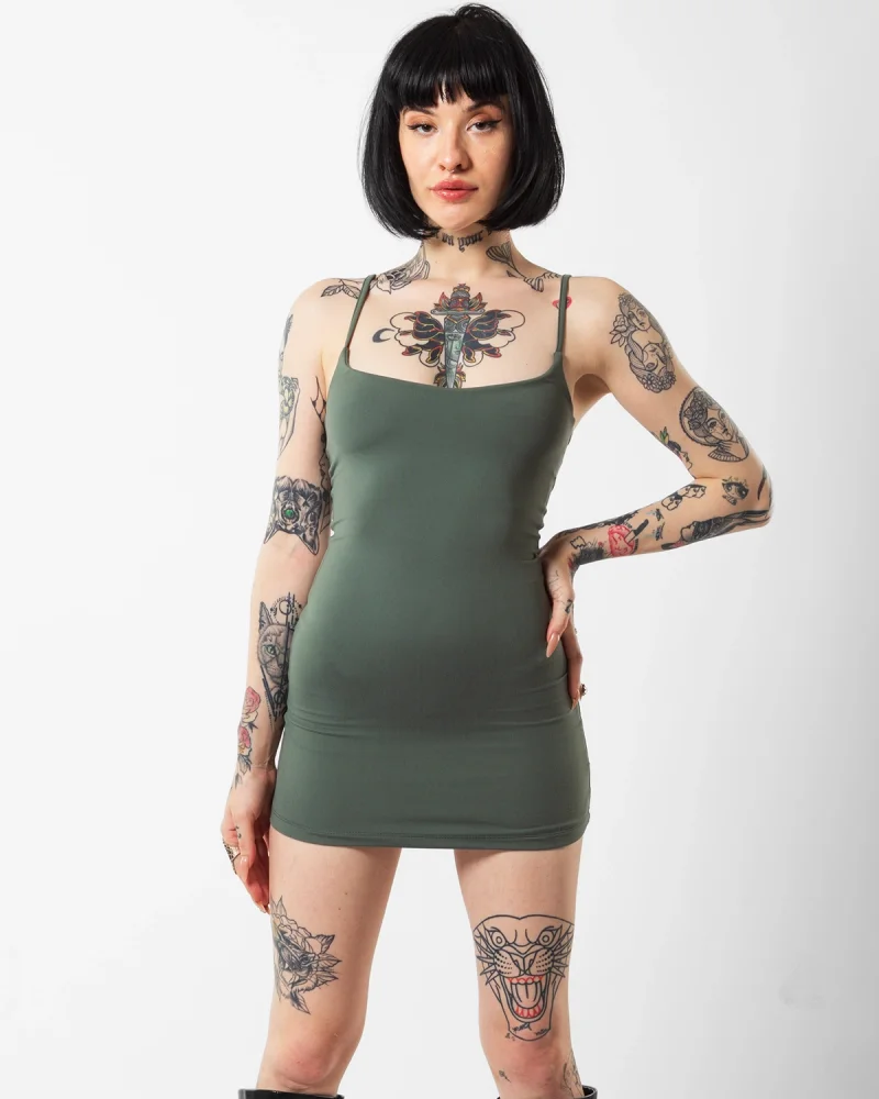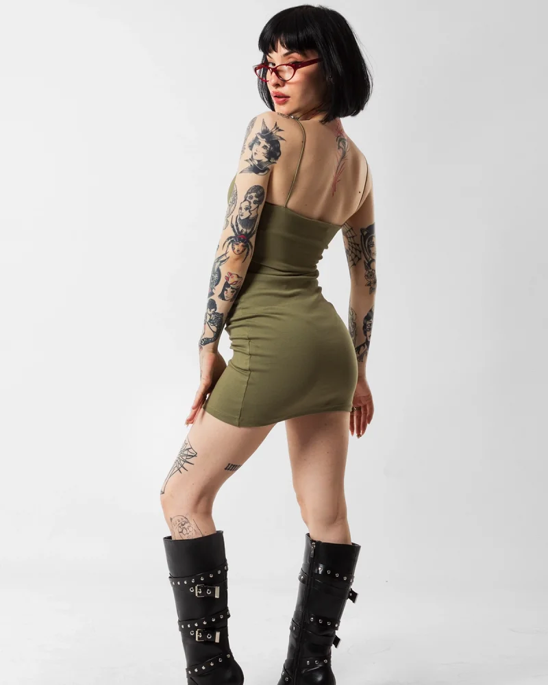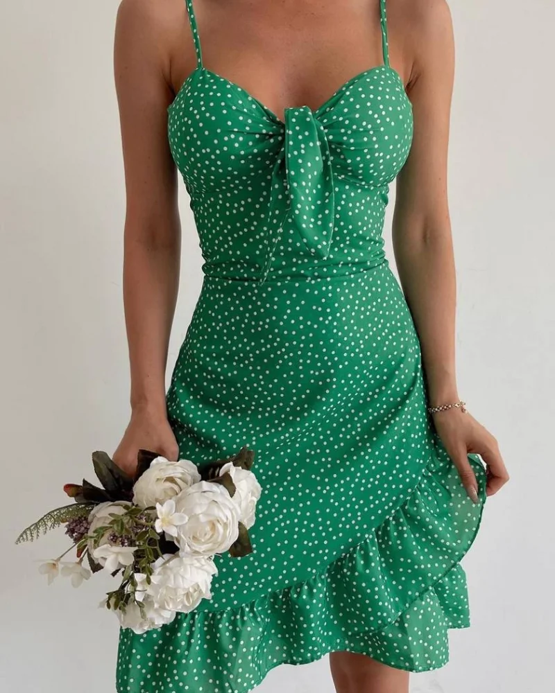 Beyaz Puantiyeli Kurdele Detaylı Fermuarlı Askılı Yeşil Elbise