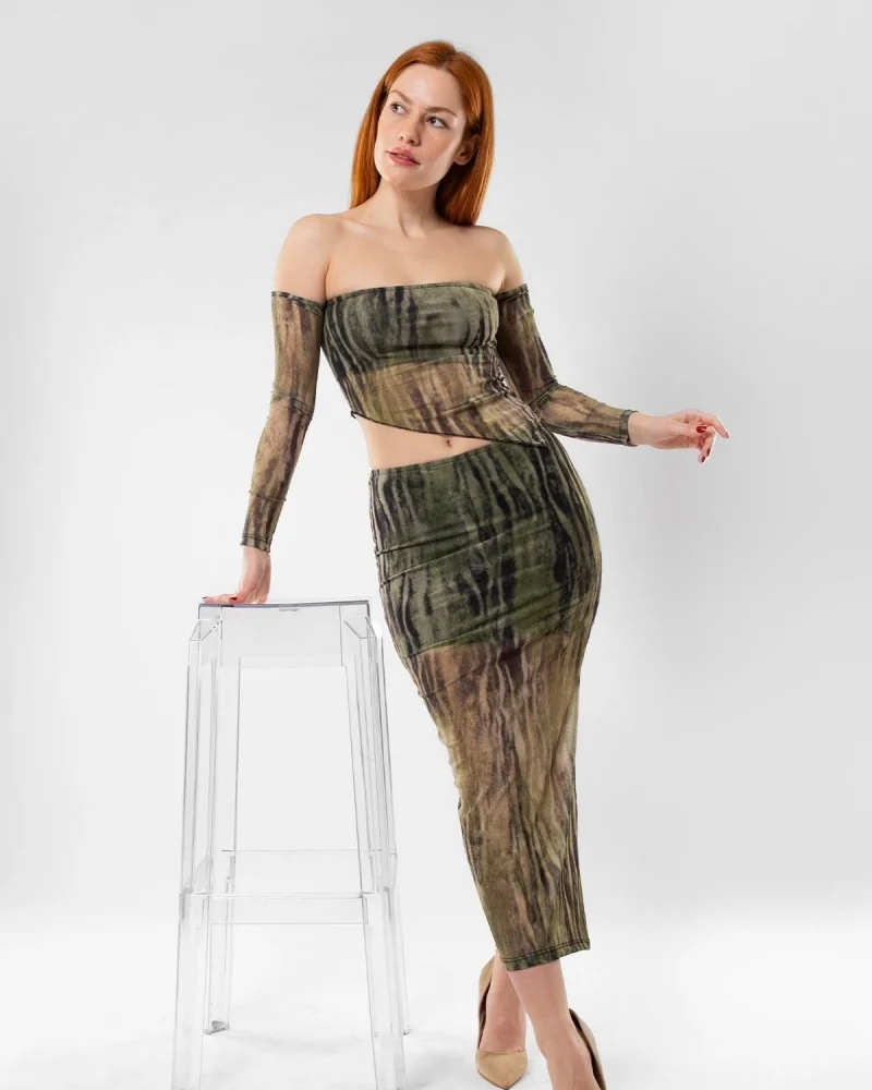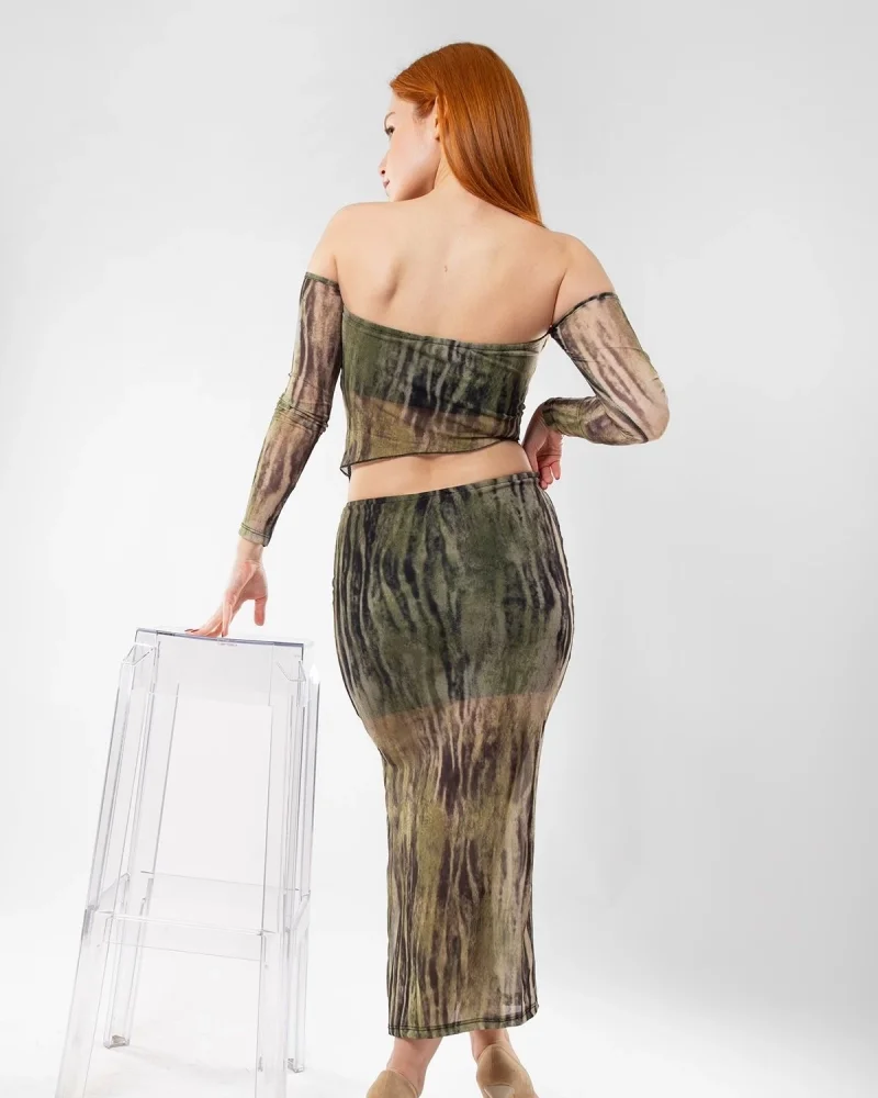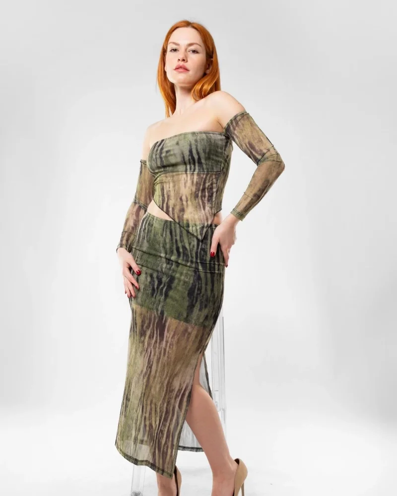 Çapraz Kesim Detaylı Astarlı Tül Yeşil Etek Bluz Takım